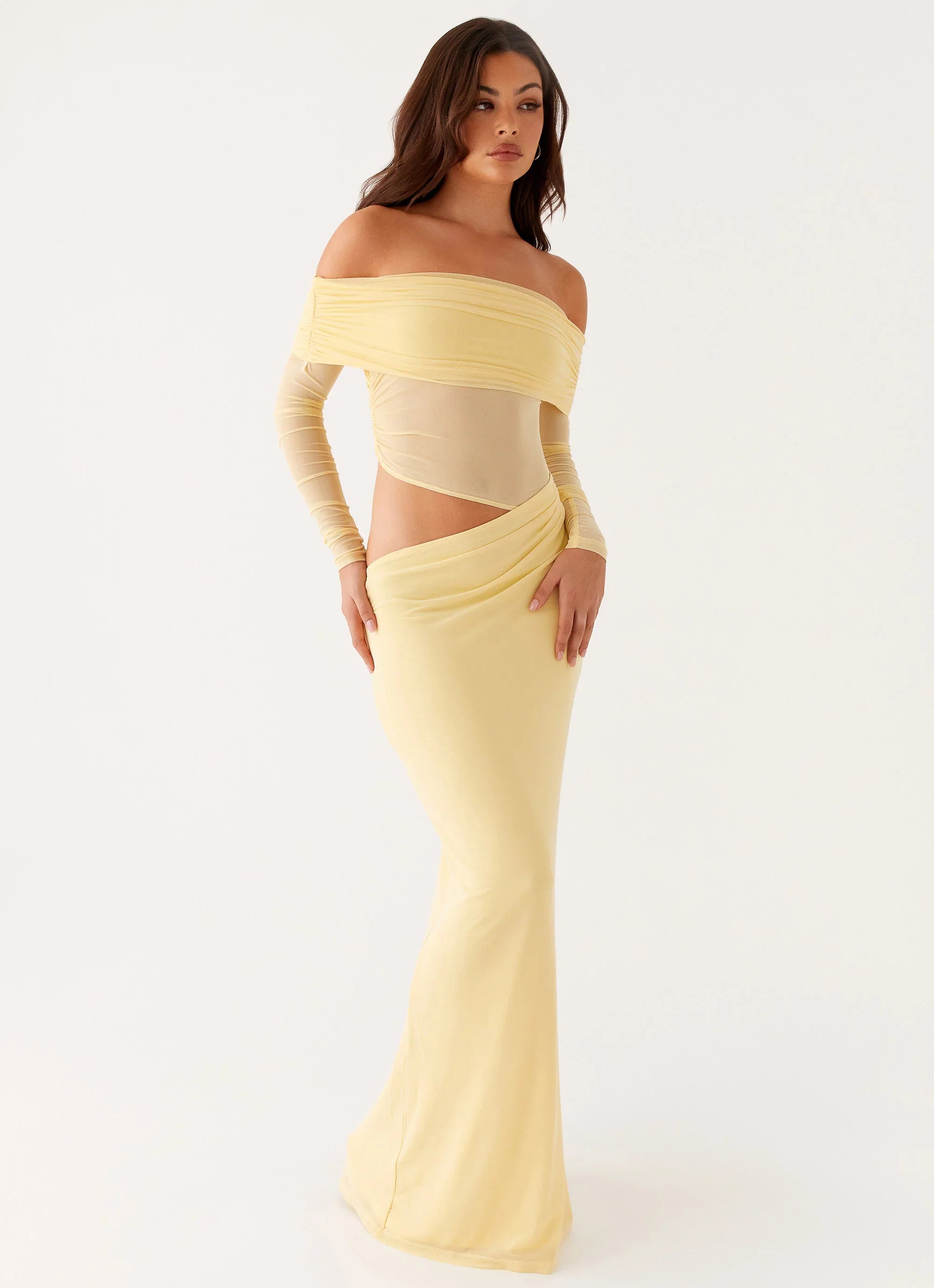 The Emery Maxi Dress is bold and sultry. Featuring an off-shoulder neckline and side cutouts that add a daring touch, this dress is crafted from stretch mesh for a sleek, figure-flattering fit. Perfect for golden-hour moments and late-night adventures, it’s a statement piece that radiates confidence.