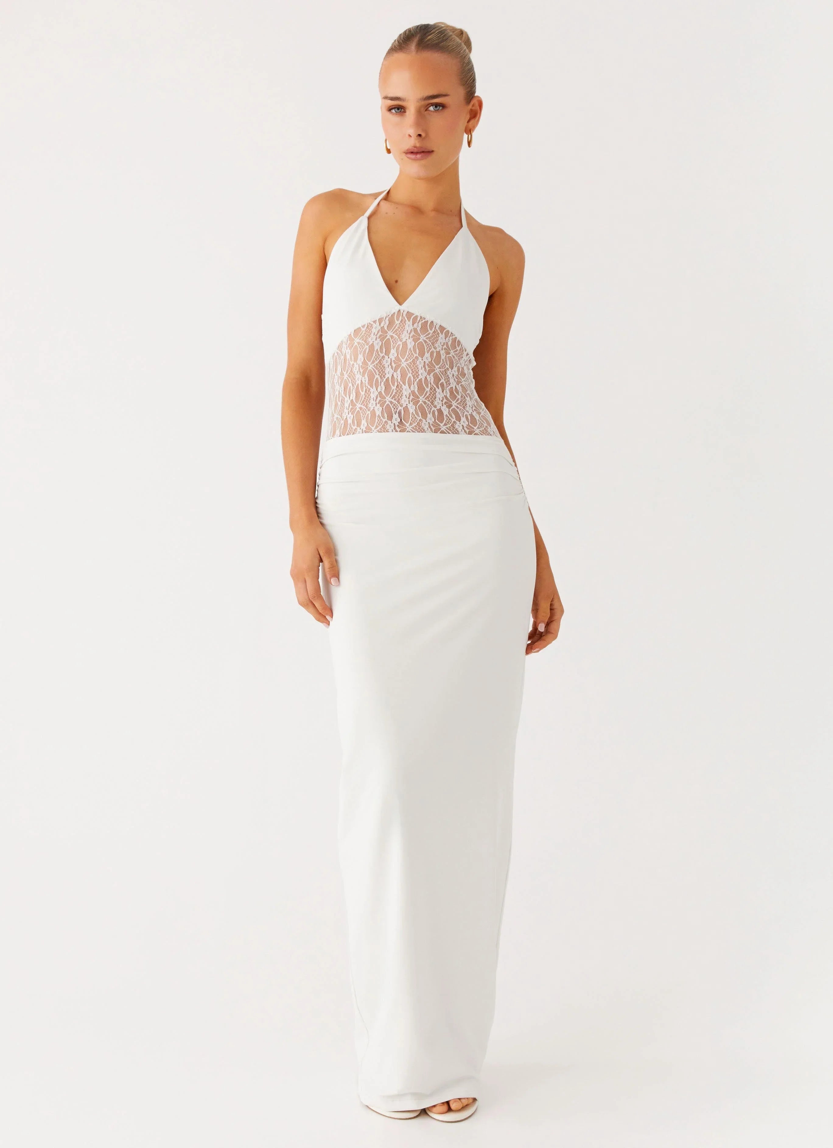 The Enchant Lace Maxi Dress is made for moonlit nights. With a flattering V neckline, lined bustier and skirt, and a semi-sheer lace bodice, it skims the body with soft ruching and a low back to finish the look.