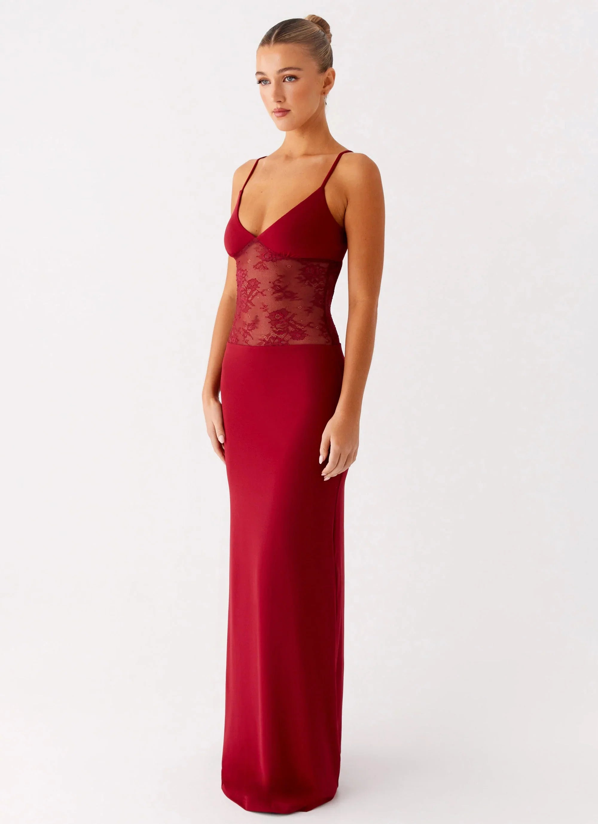 The Envy Maxi Dress is a captivating blend of elegance and allure. Featuring a plunging V-neckline and a semi-sheer bodice, it offers just the right amount of intrigue while maintaining a refined silhouette.