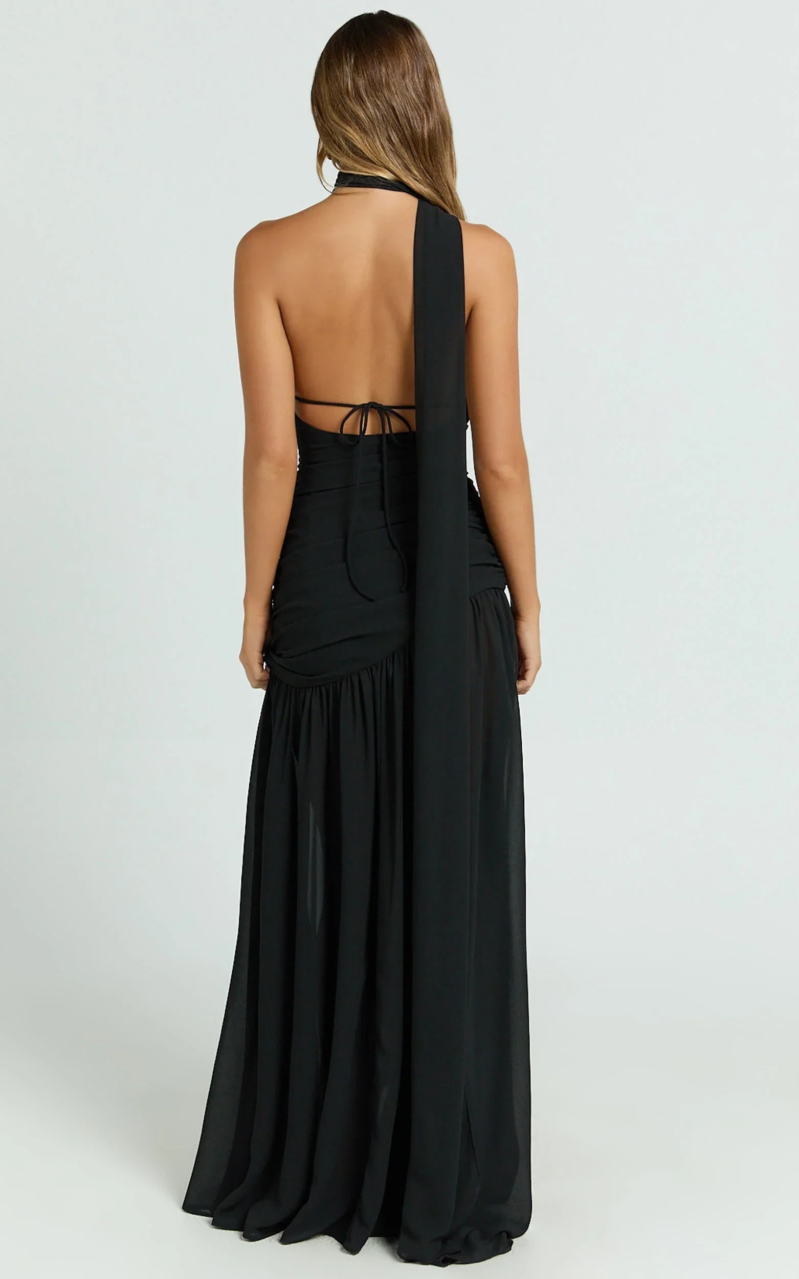 Enya Maxi Dress - One Shoulder Neck Tie Ruched High Split Dress In Black nails that runway-to-real-life vibe, polished, confident and camera-ready. Style it with minimalist sandals for a refined finish, or lean into trending energy with mesh flats for a cool contrast. Add a statement cuff bracelet or a puff heart necklace to tap into the season’s must-have accessories while keeping the look luxe and timeless.