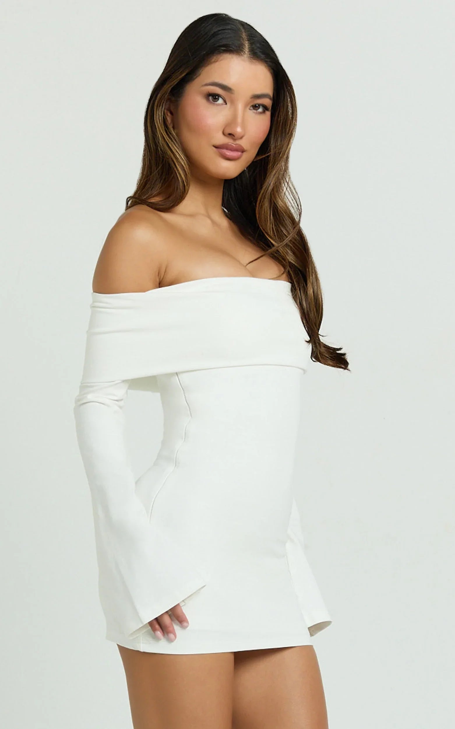 This off-shoulder mini brings wide sculpted sleeves and a fitted skirt that hugs in all the right places, finished in clean off white that reads polished yet playful. Think modern “naked dress” energy without giving too much away, ideal for nights out, rooftop cocktails, or that RSVP where chic Dresses are a must.