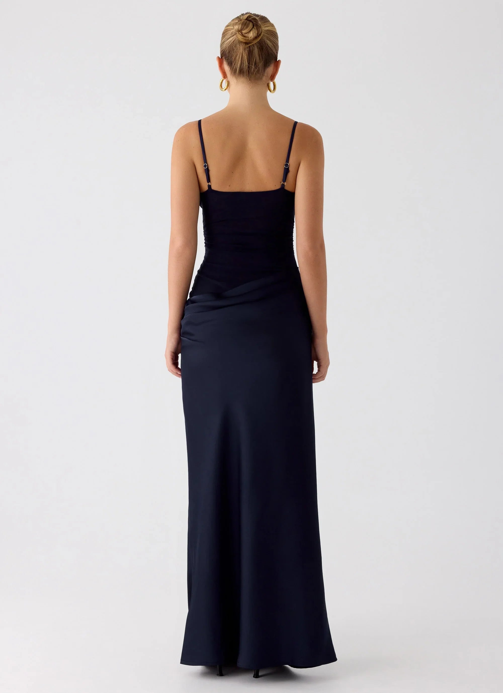 The Eternal Energy Maxi Dress moves with a late-night kind of confidence — fluid, feminine, and made for golden hour drifting into after-dark moments. With its low cowl and asymmetrical neckline balanced by a single adjustable strap, this slinky silhouette skims the body in satin and stretch mesh for an effortless slip-on finish. A maxi moment made for balmy nights and beach-to-bar escapes.
