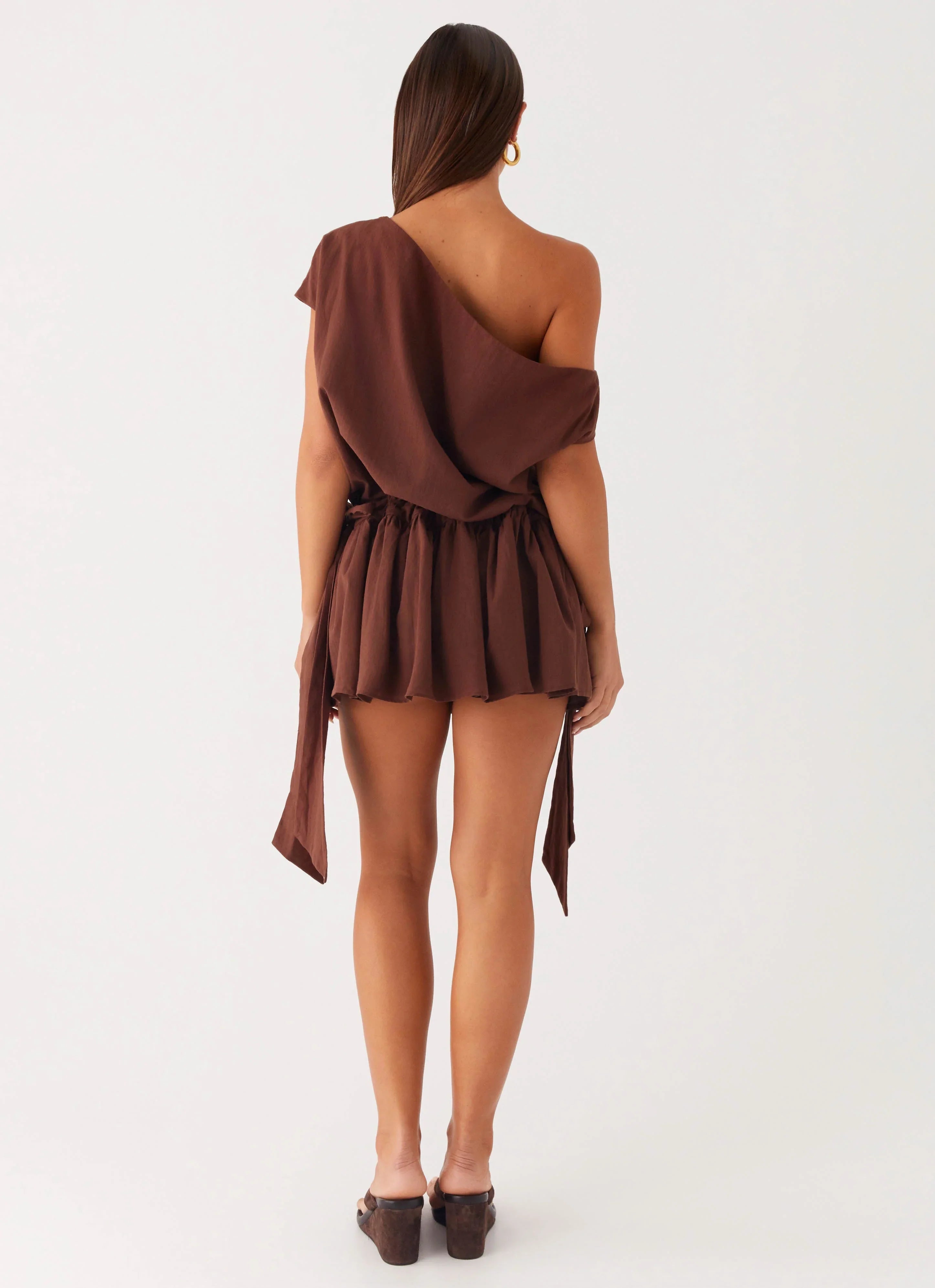 The Ettie Mini Dress in chocolate brown is made for unforgettable evenings. With an off-the-shoulder neckline, ruched waist, and flared skirt, it strikes the perfect balance between playful and elegant. A standout piece for sunset to sundown moments.