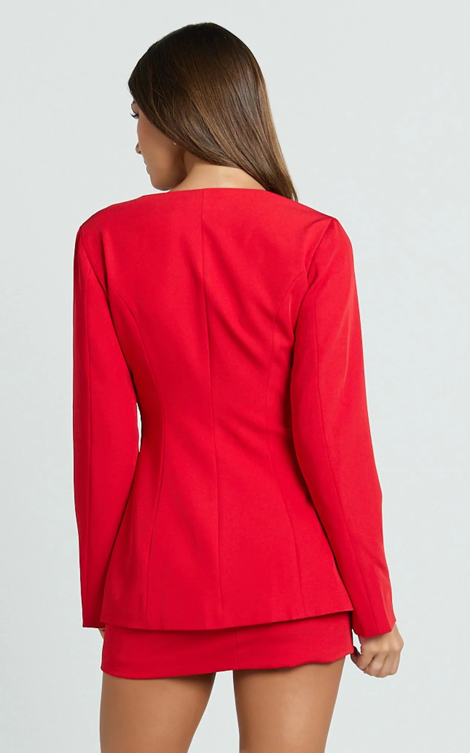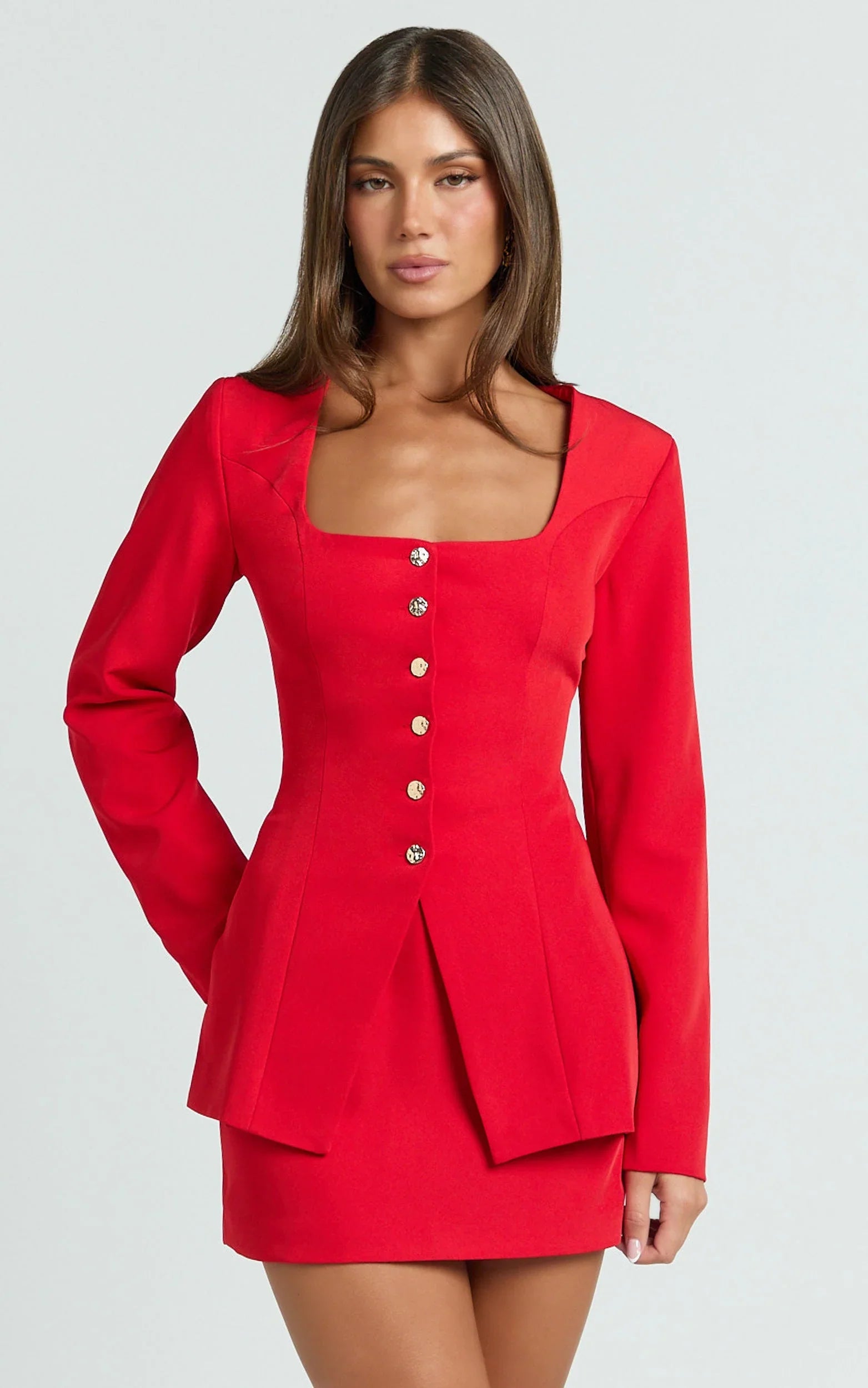 Evie Two Piece Set - Long Sleeve Button Down Tailored Top And Mini Skirt Set In Red turns every entrance into a moment, style it with pendant necklaces for an elevated glow and oversized sunglasses for that chic, off-duty finish. A bold red matching set that does the work for you, it’s the easy way to tap into coordinated dressing and trend-forward polish in one hit.