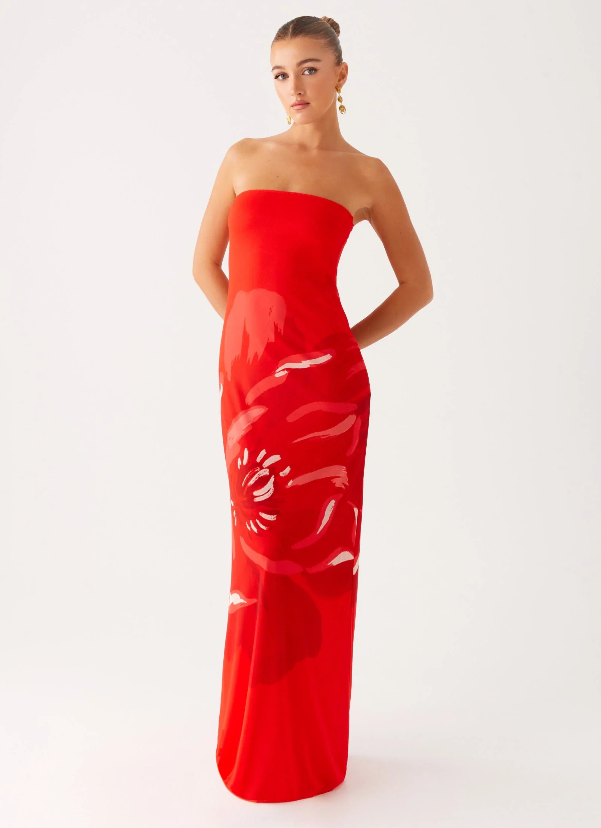 Made for nights when the city pulses and the air hums with heat. The Fabian Maxi Dress clings in all the right places with its stretch jersey fabric and sleek strapless neckline. In bold, untamed red, it’s your statement piece for golden hours, midnight moves, and everything after dark.