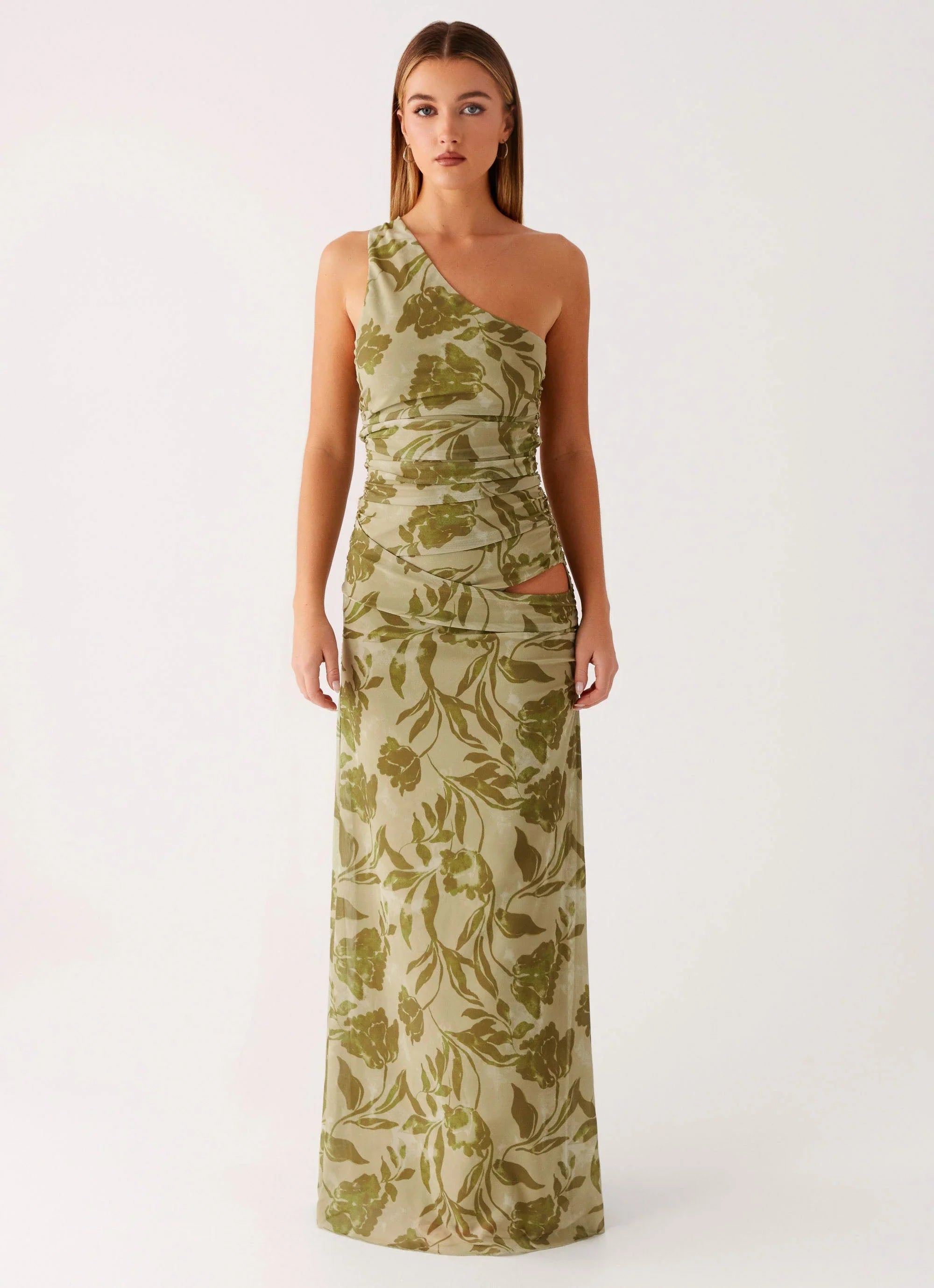 The Georgiana Maxi Dress features a maxi length with an asymmetrical neckline and ruched sides for a flattering silhouette. Crafted from stretch mesh and fully lined, it showcases an exclusive print that adds a unique touch to this elegant design.