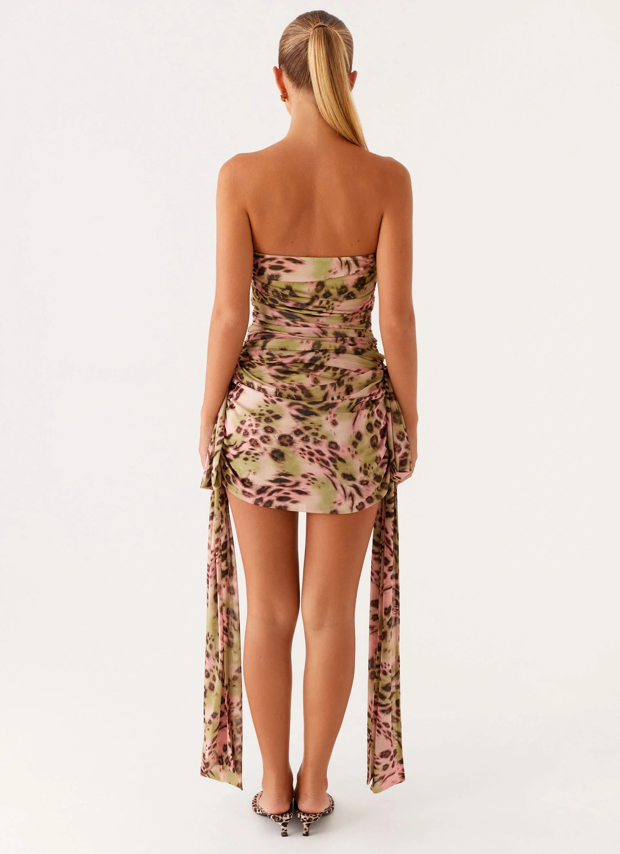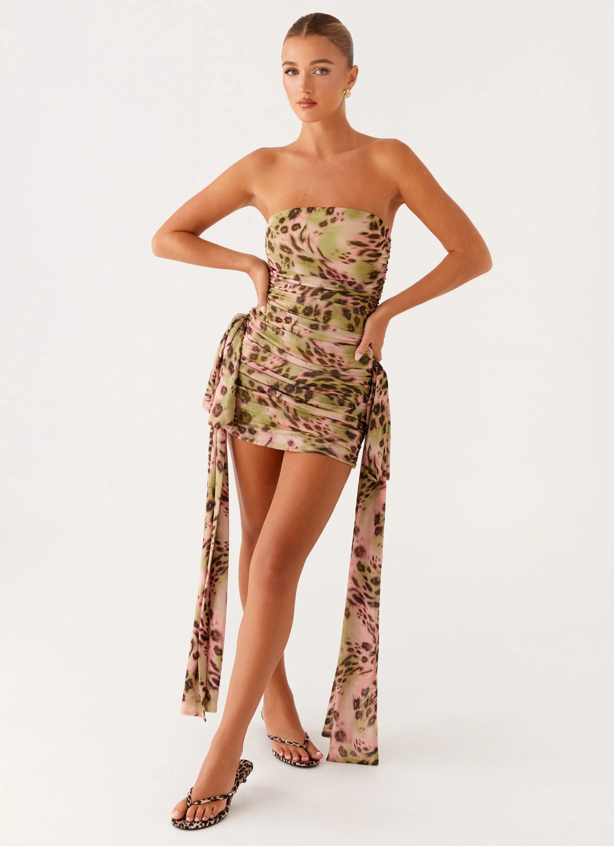 Georgie Mini Dress featuring a strapless neckline, ruched sides, and stretch mesh. A curve-hugging silhouette made for golden hour to after dark.
