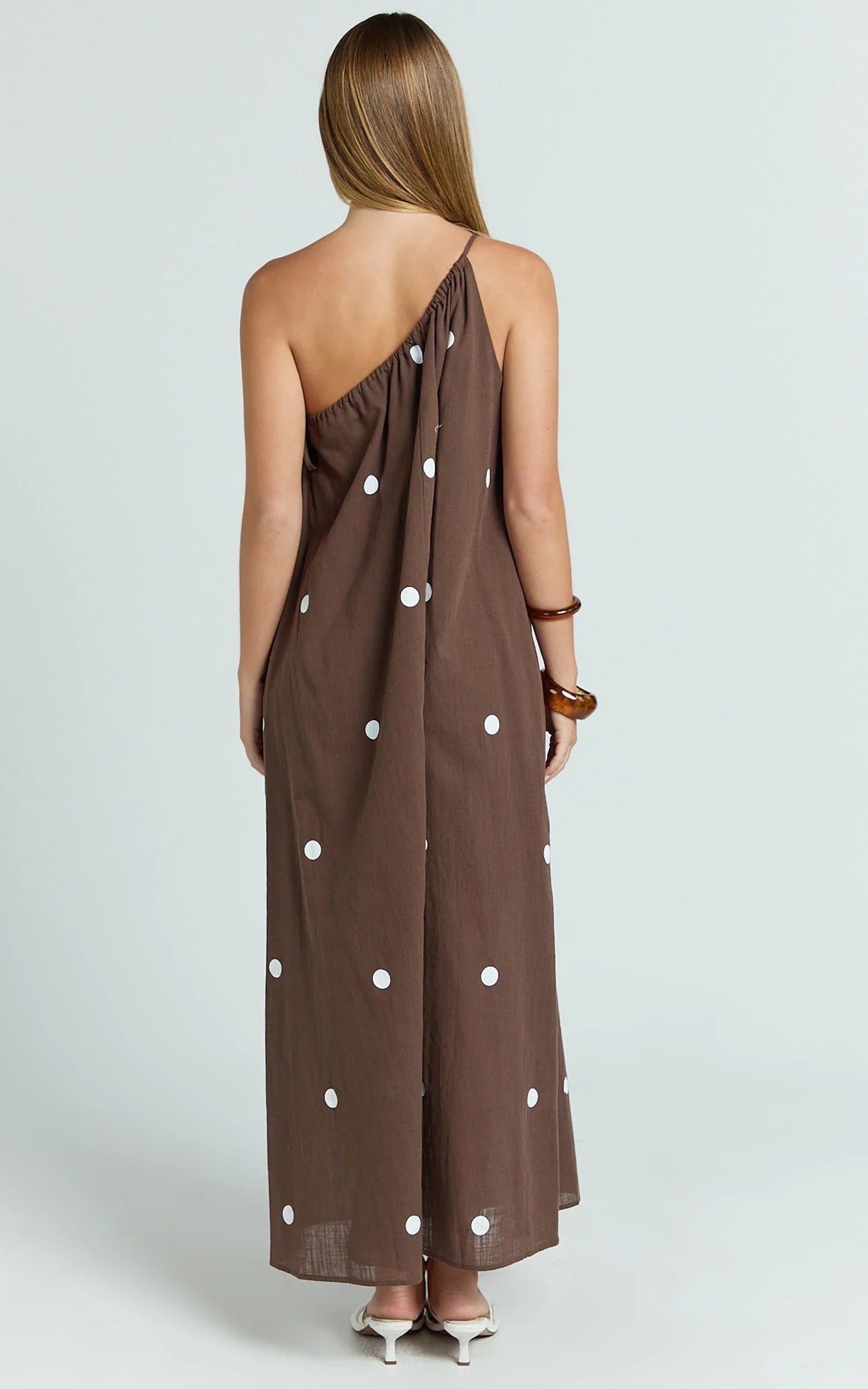 The Gia Midi Dress in Chocolate Polka Dot skims the body with a playful side split, balancing sweet and sultry for weddings, long lunches, and dance-floor plans. The asymmetric neckline feels modern and flattering, while the chocolate polka dot print brings a fresh twist to your dress lineup. Style the Gia with pendant necklaces and sleek ballet flats for an effortless look, or elevate with strappy heels and a slouchy statement bag after dark. Playful, polished, and easy to wear, this midi is made for repeat RSVPs.
