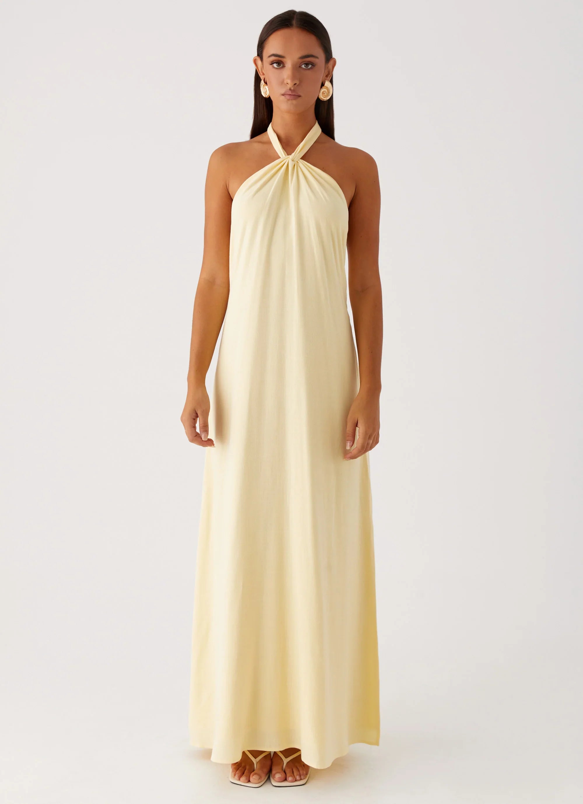 Shine bright in the Golden Child Linen Maxi Dress. The halterneck design and open back create a stunning silhouette, Perfect for making a statement under the golden skies.