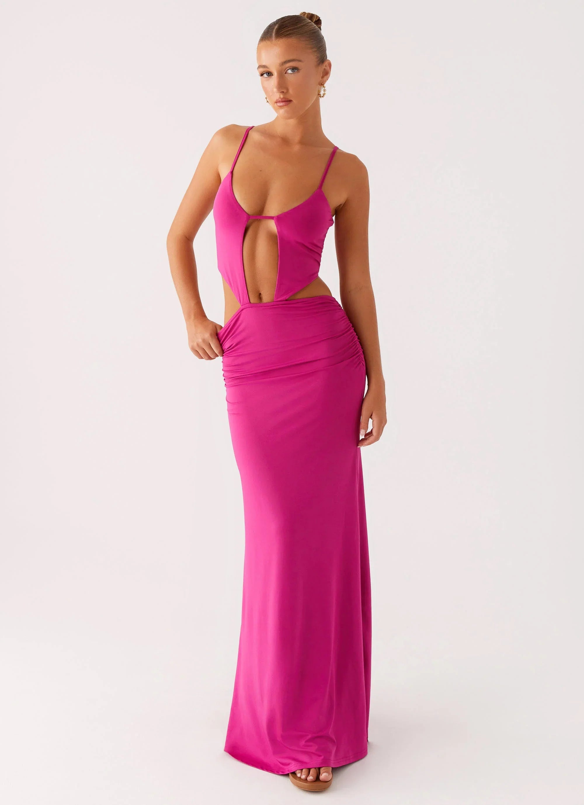 Steal the spotlight. The Headliner Maxi Dress features a rounded neckline and waist ruching that creates a flattering, sculpted silhouette. Perfect for those nights when you're the main event and every moment is yours to own.