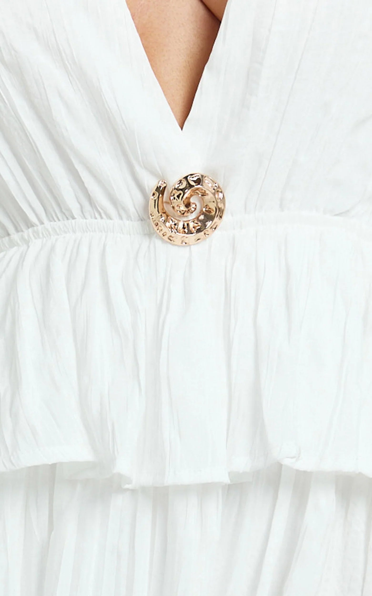 This white maxi turns every entrance into a moment with its deep V halter neckline, chic brooch detail, and a thigh-high split that elongates the silhouette. Sleek, sculptural volumes meet clean lines for a high-shine finish that photographs beautifully, perfect for parties, brides-to-be, and all-white dress codes.
