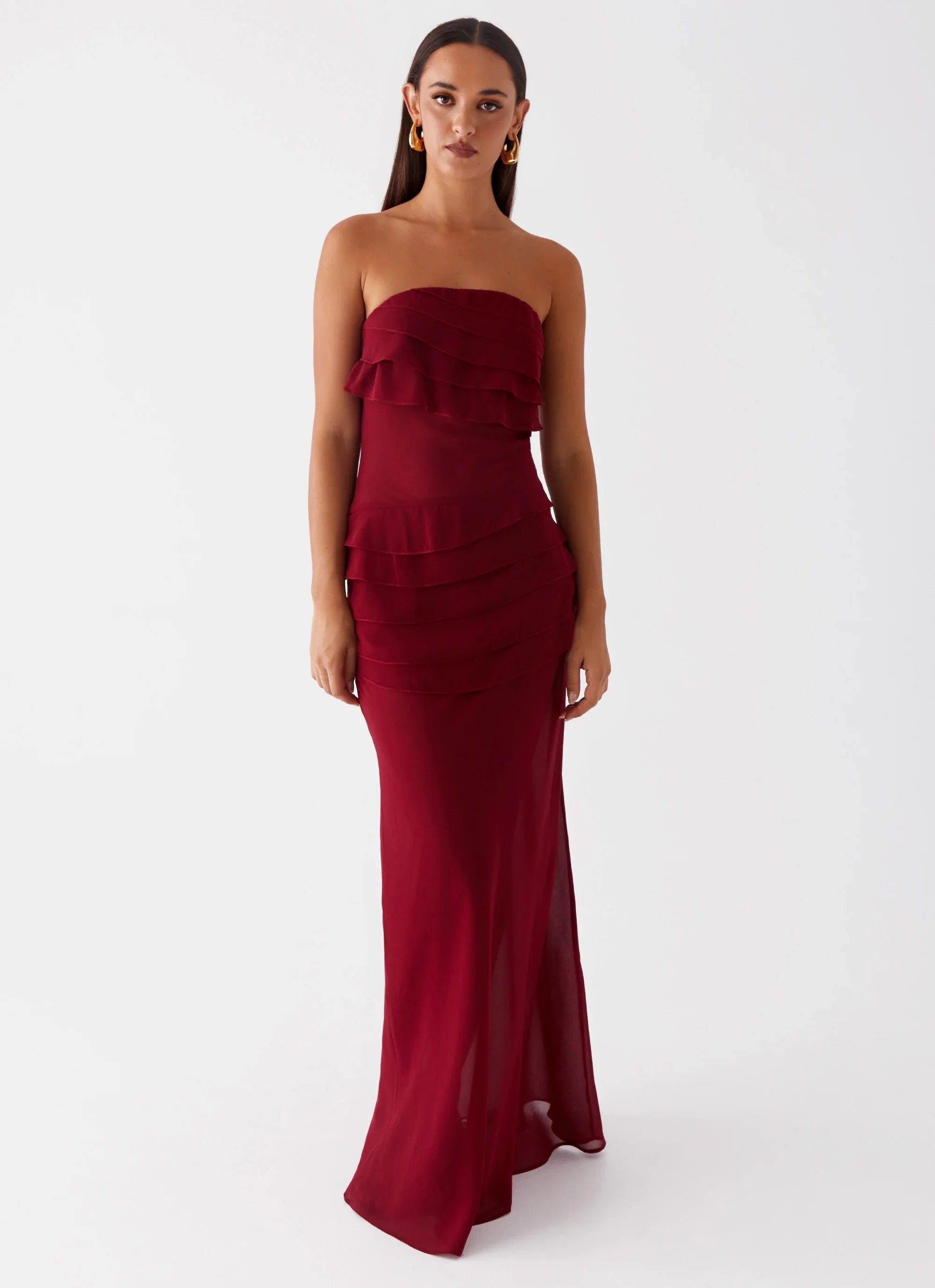 Embrace the evening in the Into The Night Maxi Dress. Featuring a strapless neckline and elegant ruffled detailing, this dress combines sophistication with a touch of romance. Perfect for making a statement from dusk till dawn.