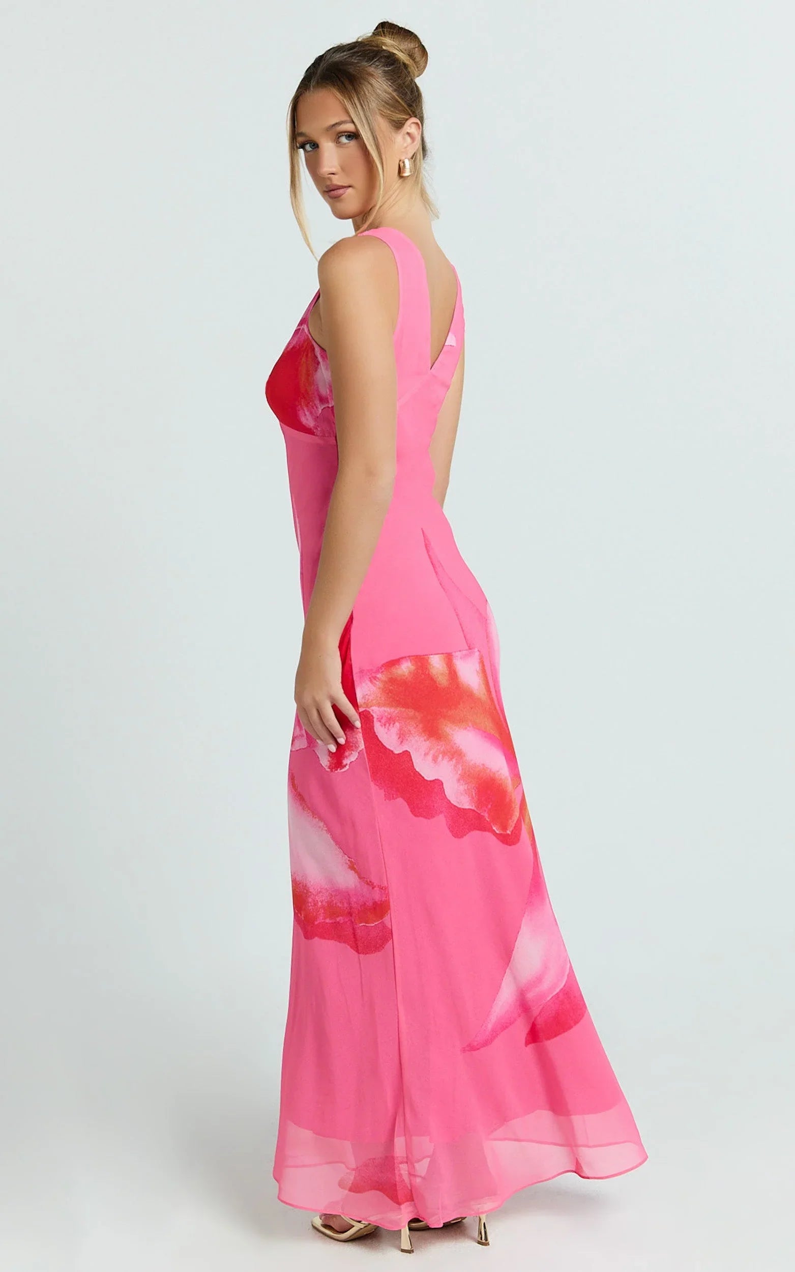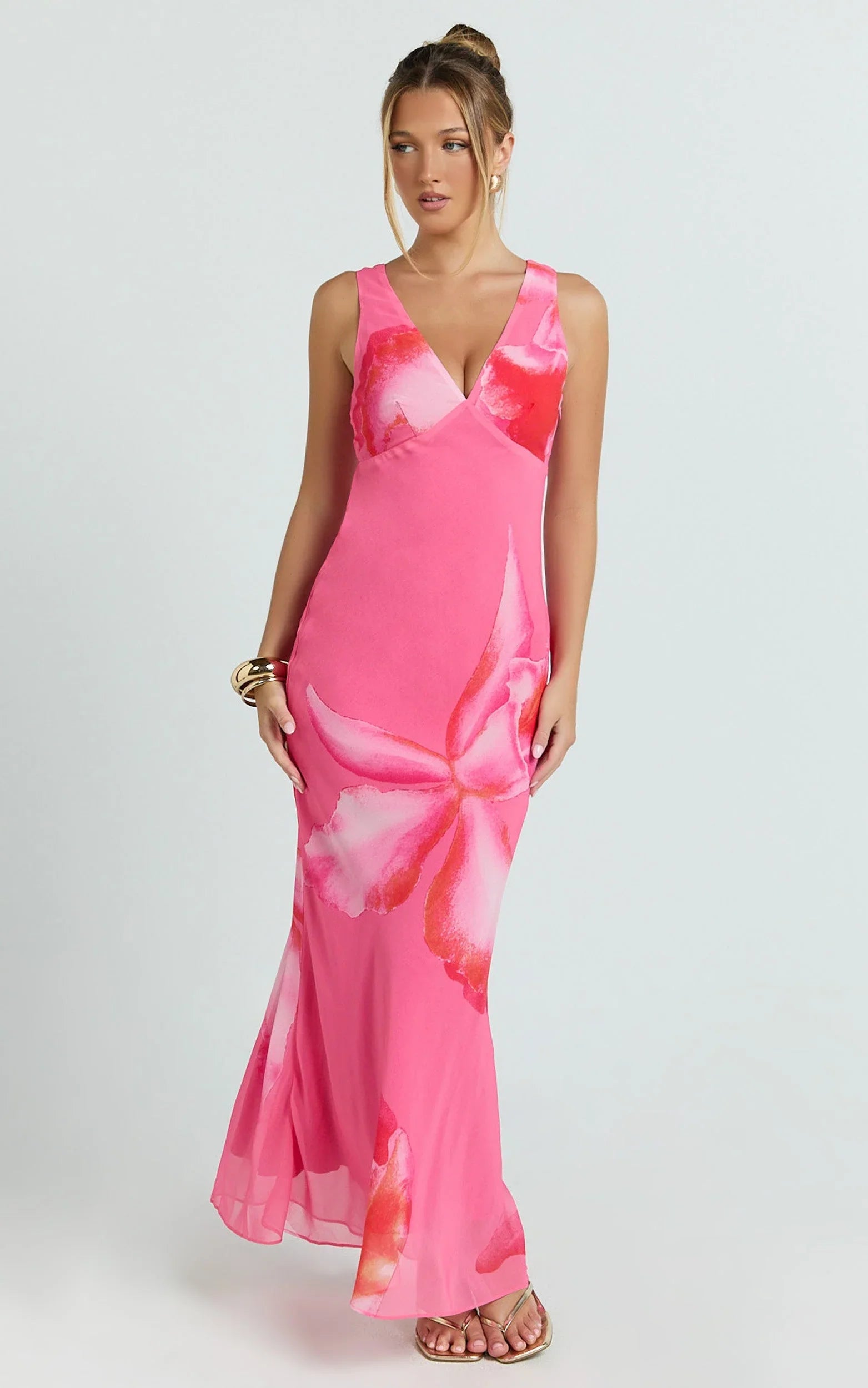 This sleeveless V neckline maxi shows off a fitted bodice and flowy skirt that skims and swishes with every step, flattering your shape while keeping it effortless for any event. The fuschia floral print pops for daytime parties, wedding guest looks, or date nights, and the elongating cut makes it an easy go-to in your Dresses rotation.