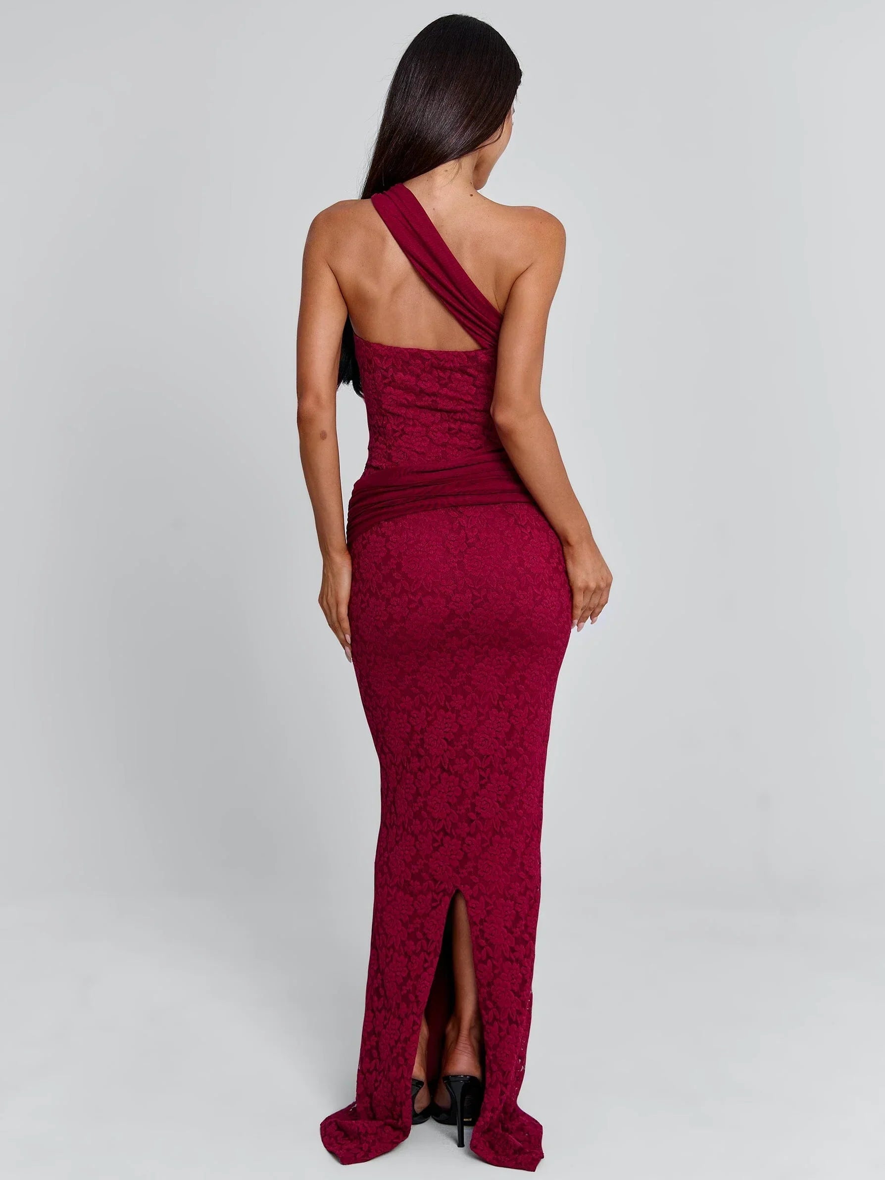Crafted from a lace fabrication and fully lined, Irma features contrast jersey panelling that enhances the figure. The design is finished with a fixed waist tie that drapes elegantly, creating a flattering silhouette. With its one-shoulder neckline and floor-skimming length, this dress is the epitome of effortless sophistication!