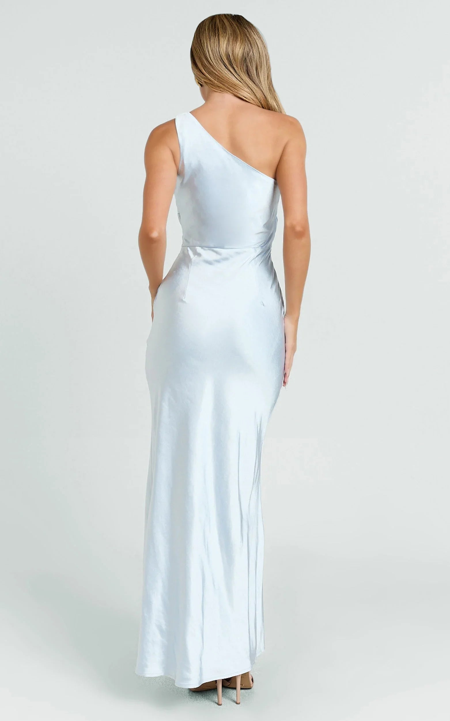 Style the Isla Maxi Dress - Satin One Shoulder Side Split Dress In Sky Blue with pendant necklaces and oversized sunglasses for a statement finish, or lean into soft layering with a delicate shawl. Ideal for weddings, cocktails and occasion dressing, it sits firmly in your most-worn Dresses lineup, refined, modern, and made to turn heads.