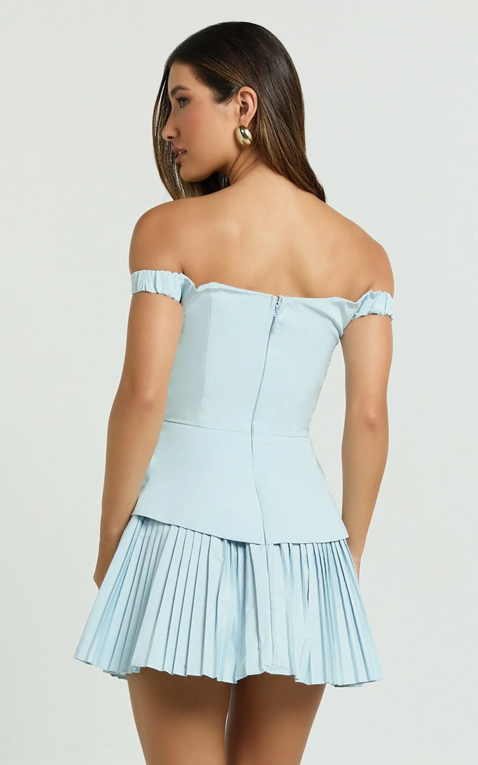 This off-shoulder pleated mini serves flirty neckline, snatched waist and airy movement, made for dance floors, date nights and every “just add heels” moment. The sculpted bodice and swirl of pleats catch the light so beautifully you’ll feel like the moment in every snap.