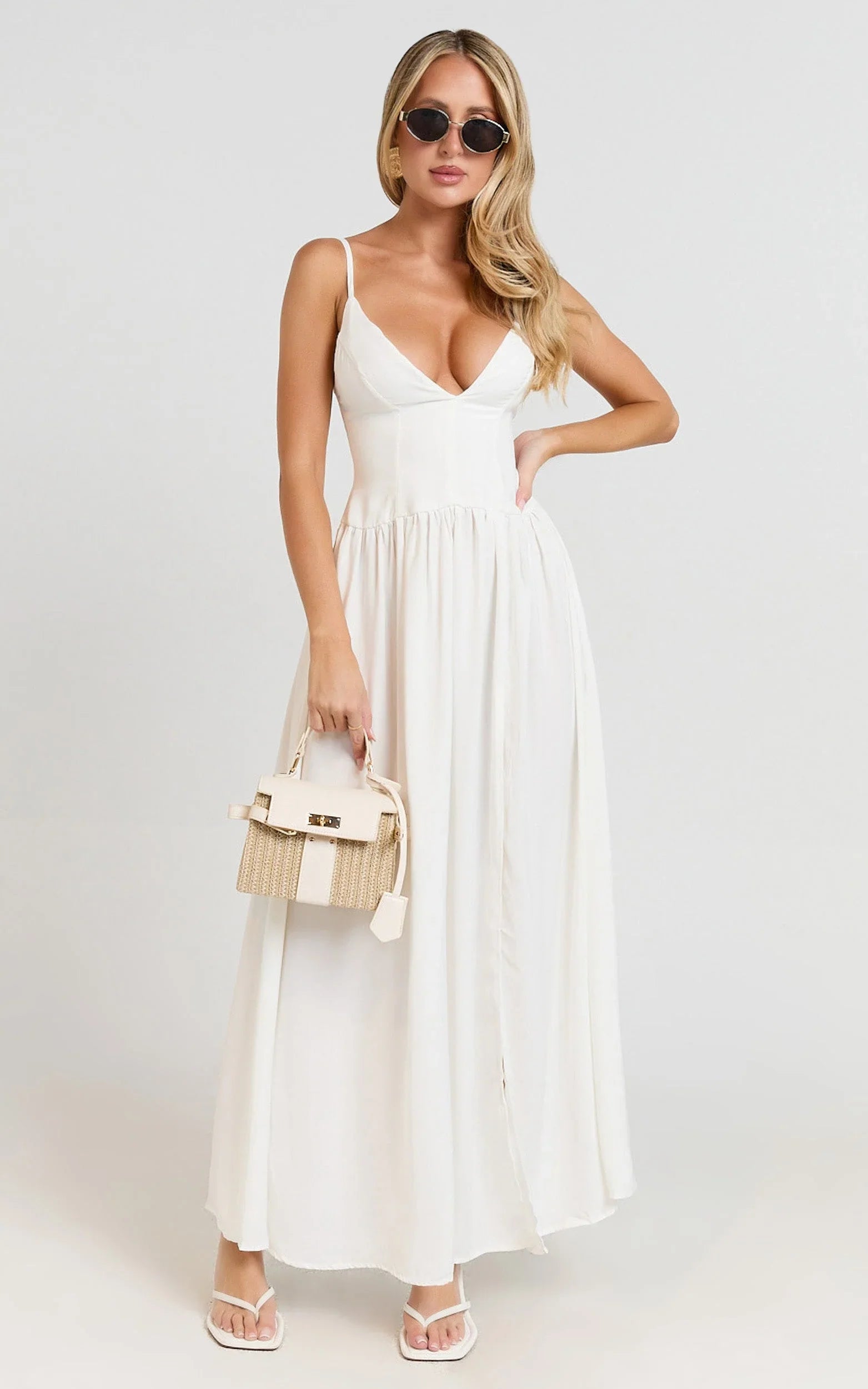 Jamilla turns every entrance into a moment, think aisle, rooftop or sunset soirée. The fluid silhouette and high leg split keep it flirty yet refined, while the clean off white palette lets your accessories shine. Add delicate hoops and a slick bun to keep the focus on that plunging neckline and statement split, and you’re set.