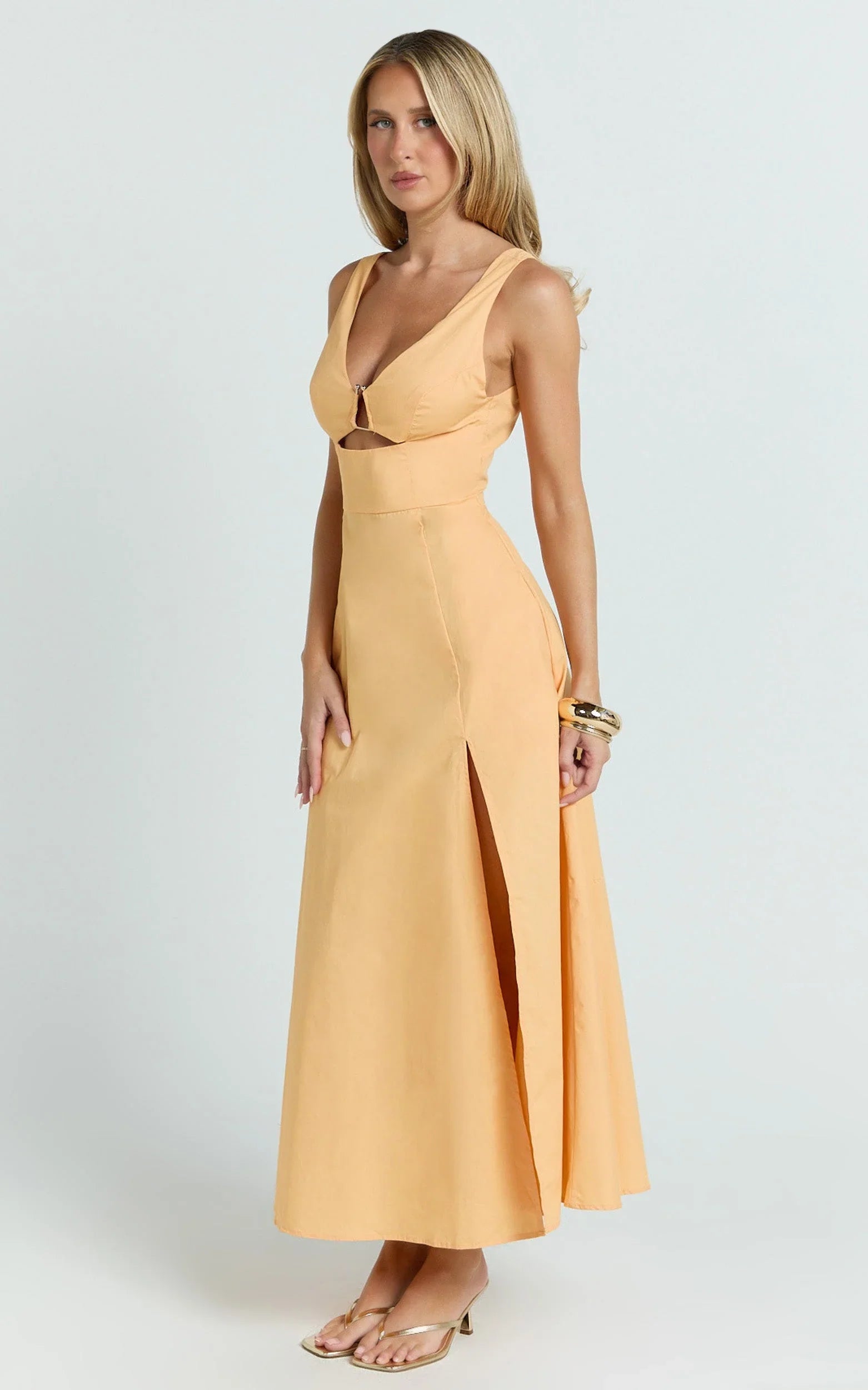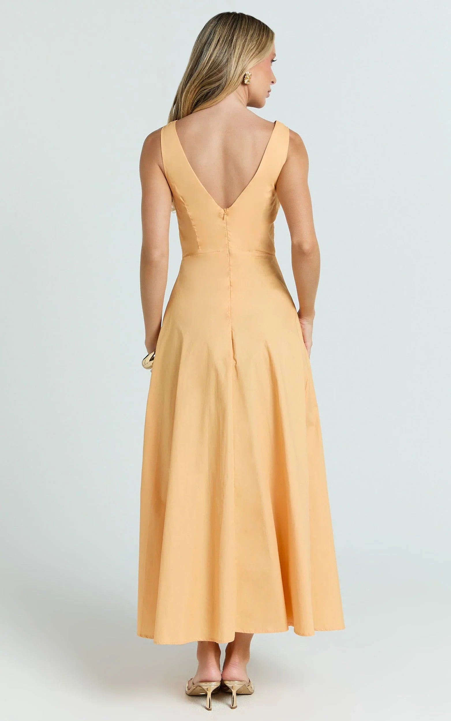 The Jaycee Midi Dress in Orange features a flattering V-neckline, trim detailing and a fit-and-flare silhouette that cinches the waist and flows just right - making your orange moment feel instantly chic. From long lunches to dance floors, this midi is all about easy confidence with a swishy, picture-perfect finish. Jaycee turns heads with its curve-skimming bodice and flirty skirt that moves with you. Clean lines give it a minimalist edge, while the bold hue keeps it fun and wearable from day to night. Style it with strappy heels and a dainty shoulder bag to complete the look.