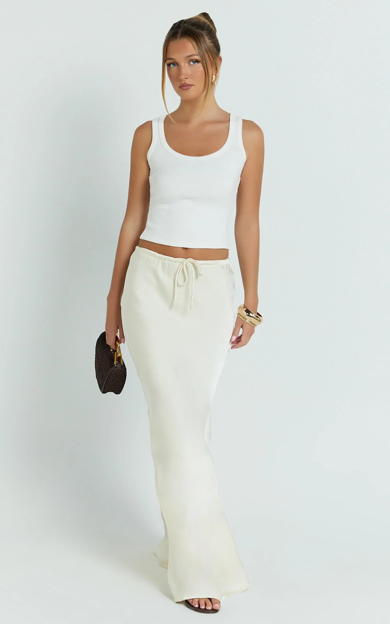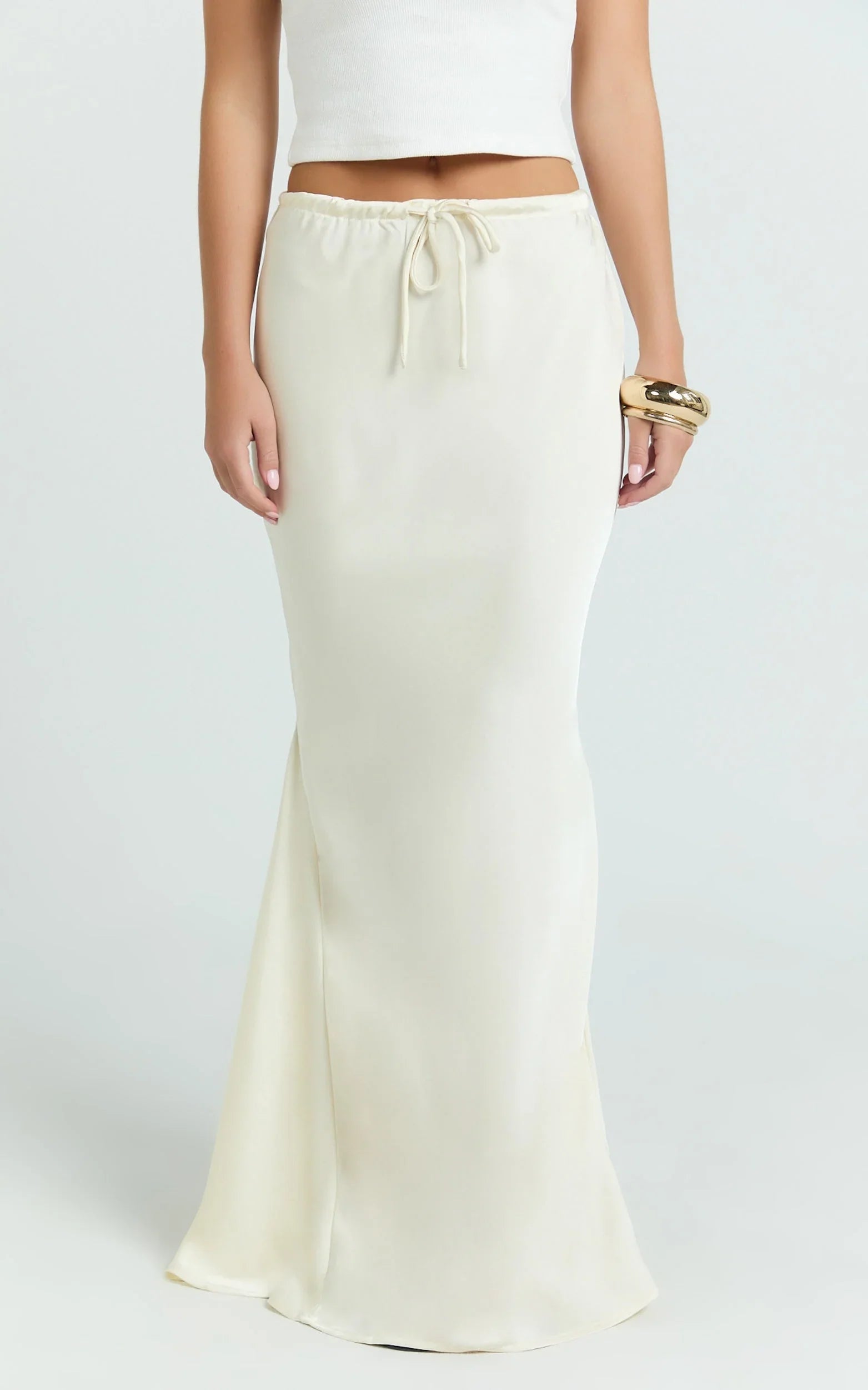 The elegant White tone pairs with everything, while the maxi length leans into Everyday Preciousness, elevated enough for events, easy enough for day-to-night. A refined staple in the Skirts category that nails minimal luxe with maximum impact.