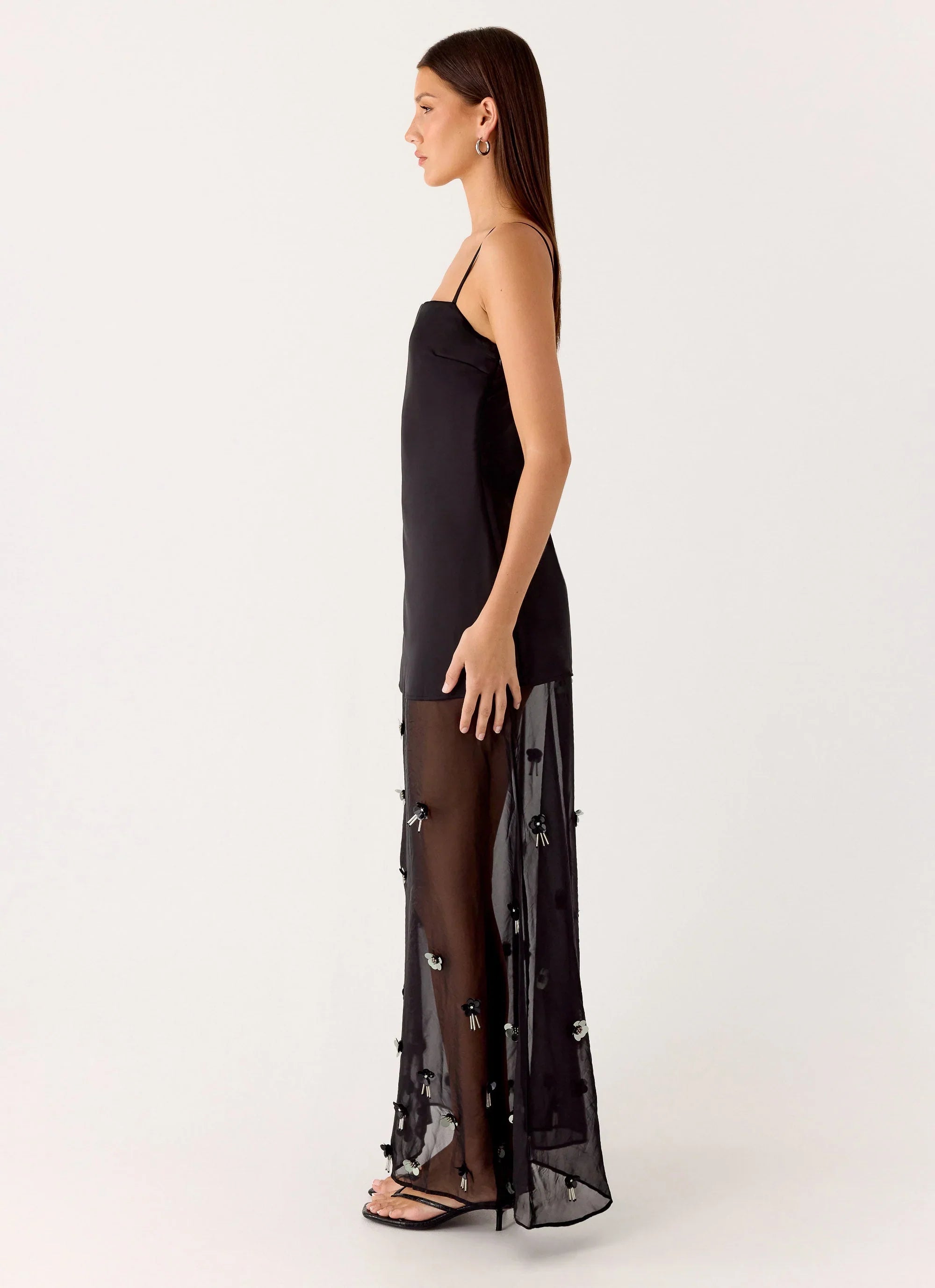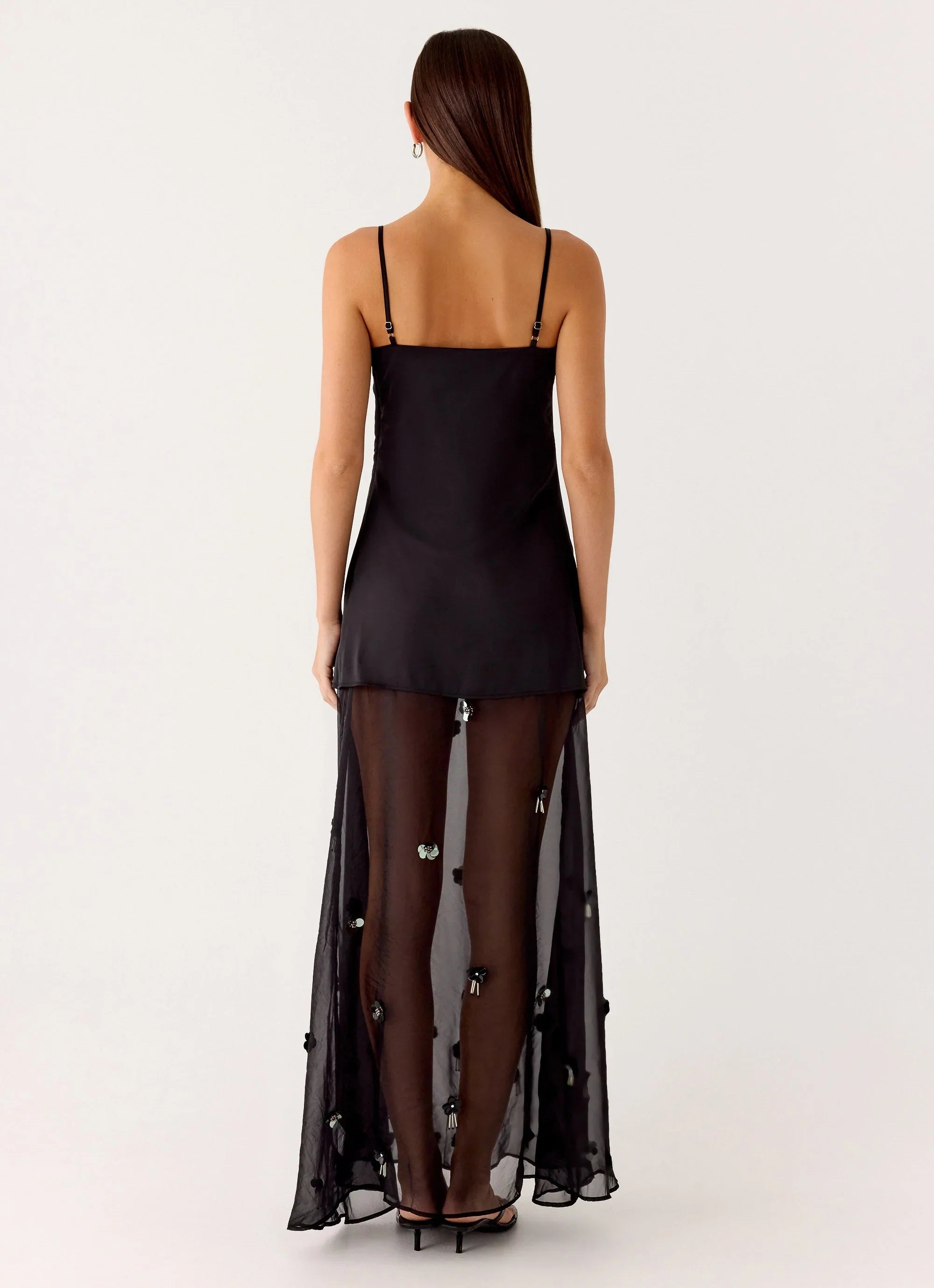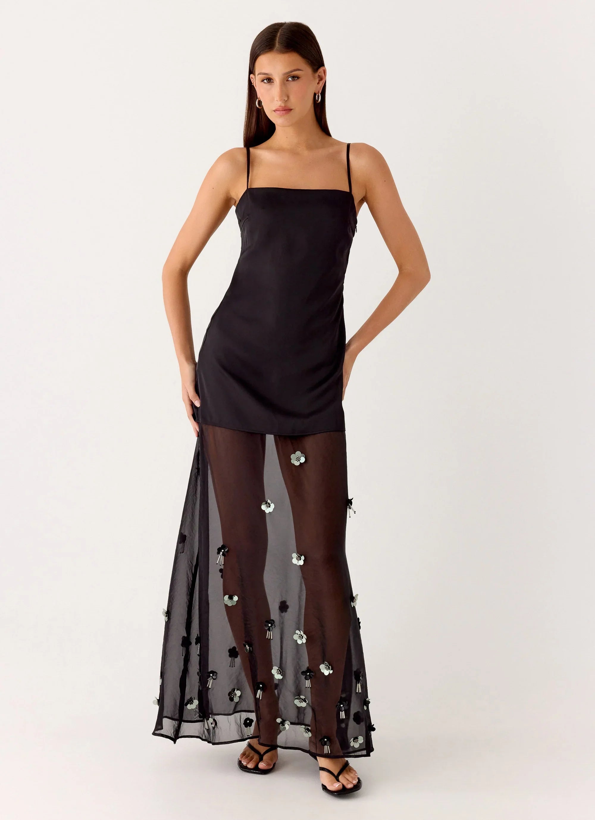 The Jesiah Embellished Maxi Dress is made for sunset-to-sundown elegance and statement evenings. Featuring a straight neckline with adjustable straps and a flowing chiffon skirt, this fully lined maxi silhouette is crafted in embellished satin for a body-skimming, glamorous fit. Perfect for golden hour to after-dark styling.