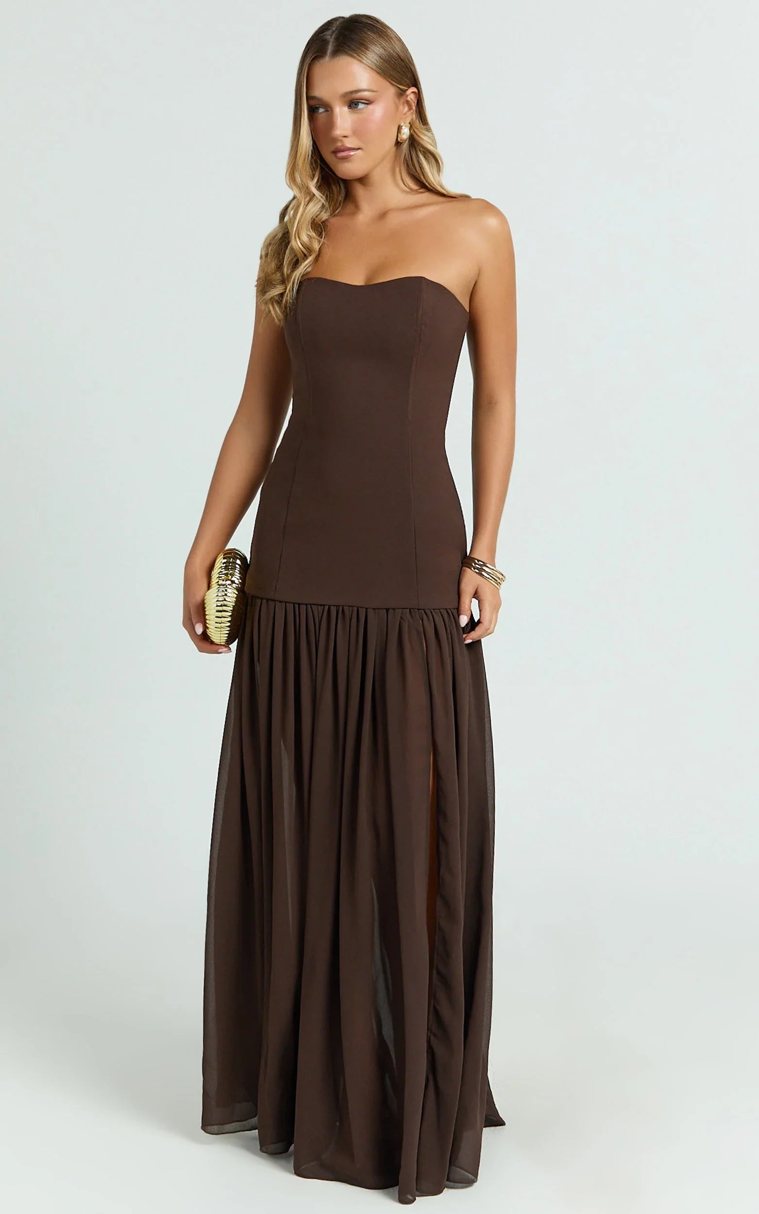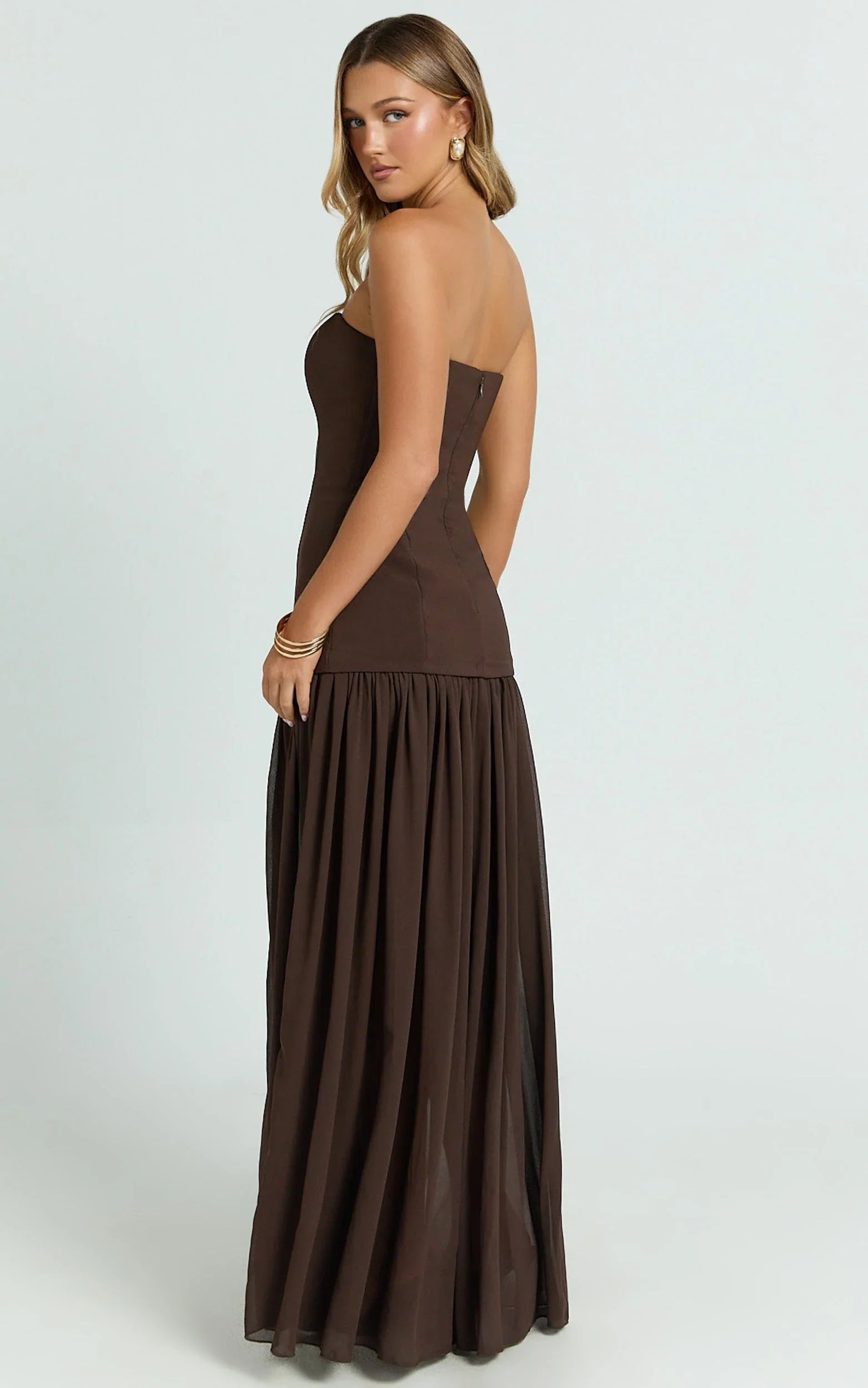 Featuring a gorgeous strapless neckline and ruched bodice, this chocolate-brown beauty hugs your curves for a flattering hourglass silhouette before flowing gently into an elegant fit-and-flare skirt. With playful asymmetrical detailing at the hem, it's a standout choice for special occasions.