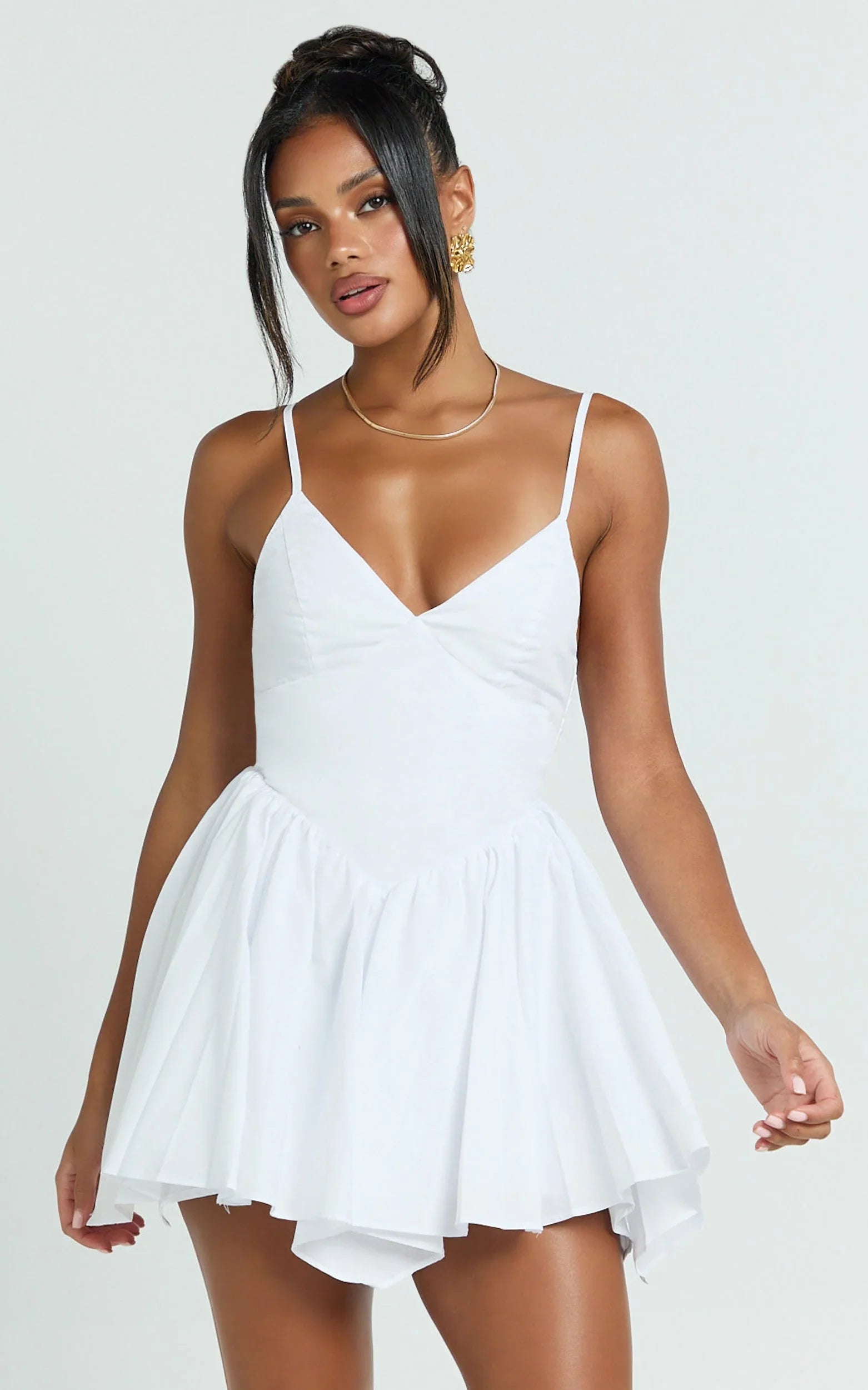 This flirty mini features a deep V neckline, drop V waist and soft pleats that sculpt and swish, perfect for parties, date nights and everything in between. The clean White finish makes it a standout in Dresses, and the silhouette brings major Bowcore energy while nodding to layering dresses for effortless outfit repeats. Dress it up with heeled flip-flops or keep it playful with thong sandals for that sleek, leg-lengthening vibe.