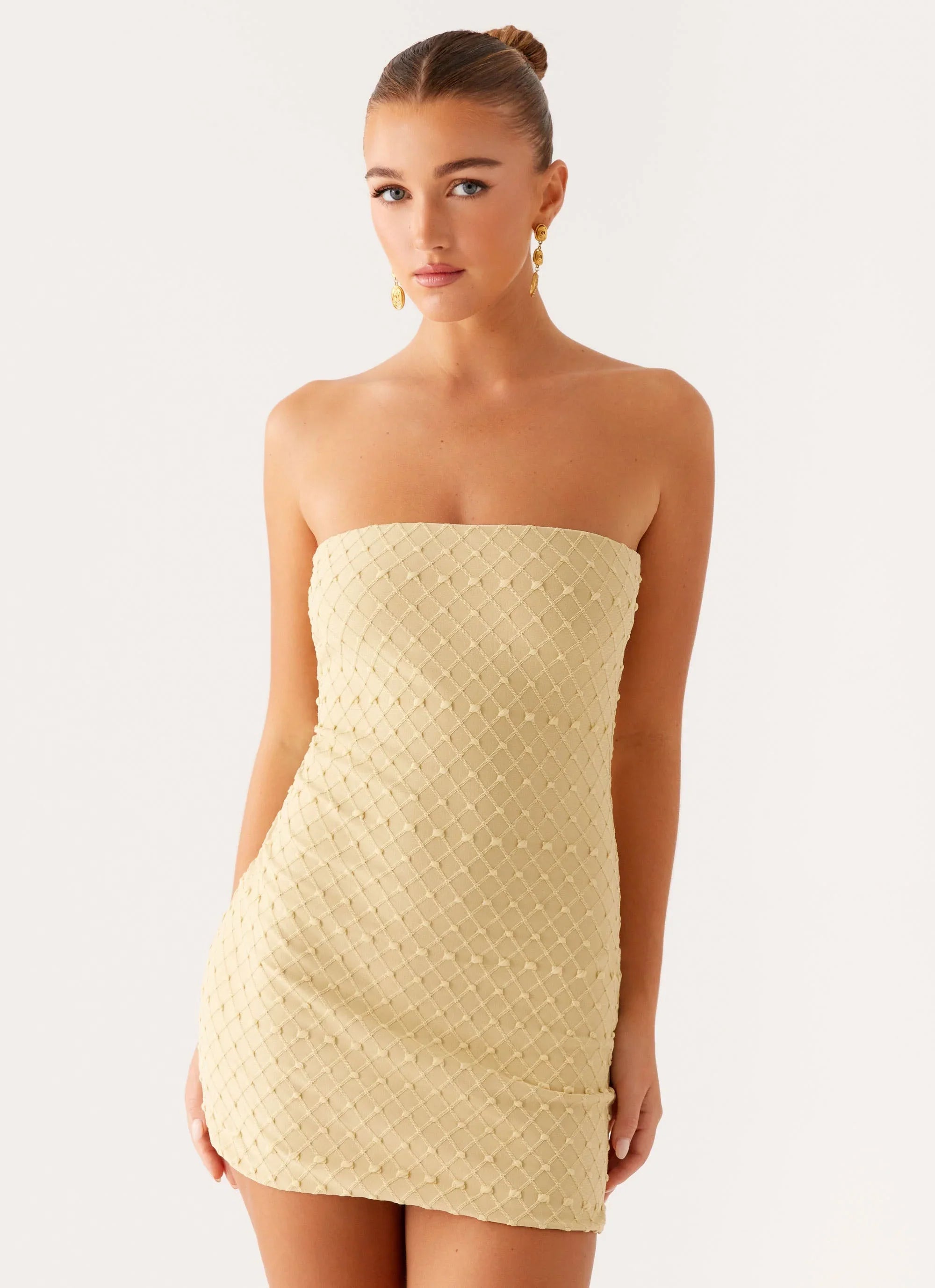 The Kamari Mini Dress is a playful staple with a frilled neckline, ruffled elastic straps, and a soft stretch texture. Silicone taping keeps it secure while the mini length adds a flirty finish.