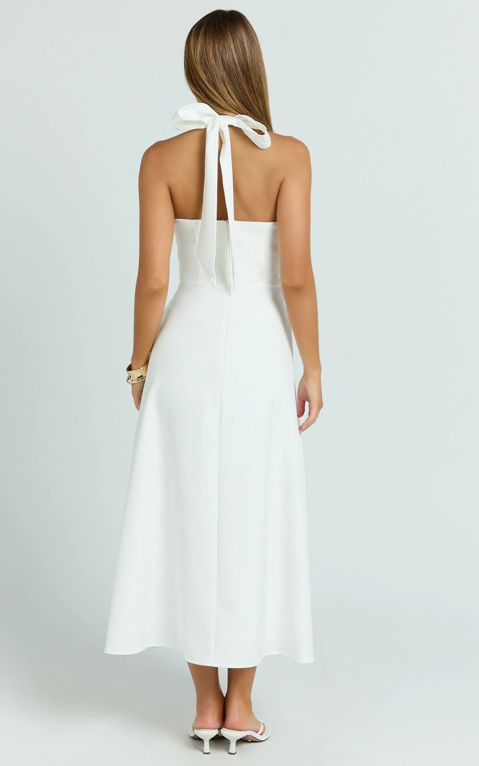 A halter neckline frames the shoulders, while the fitted bodice flows into a soft A-line skirt for that floaty finish, perfect for engagement parties, long lunches, or modern-minimal bridal vibes. Trending touchpoints? Add subtle rosettes or lean into sheer statements with your layers to keep the look fresh and fashion-forward.