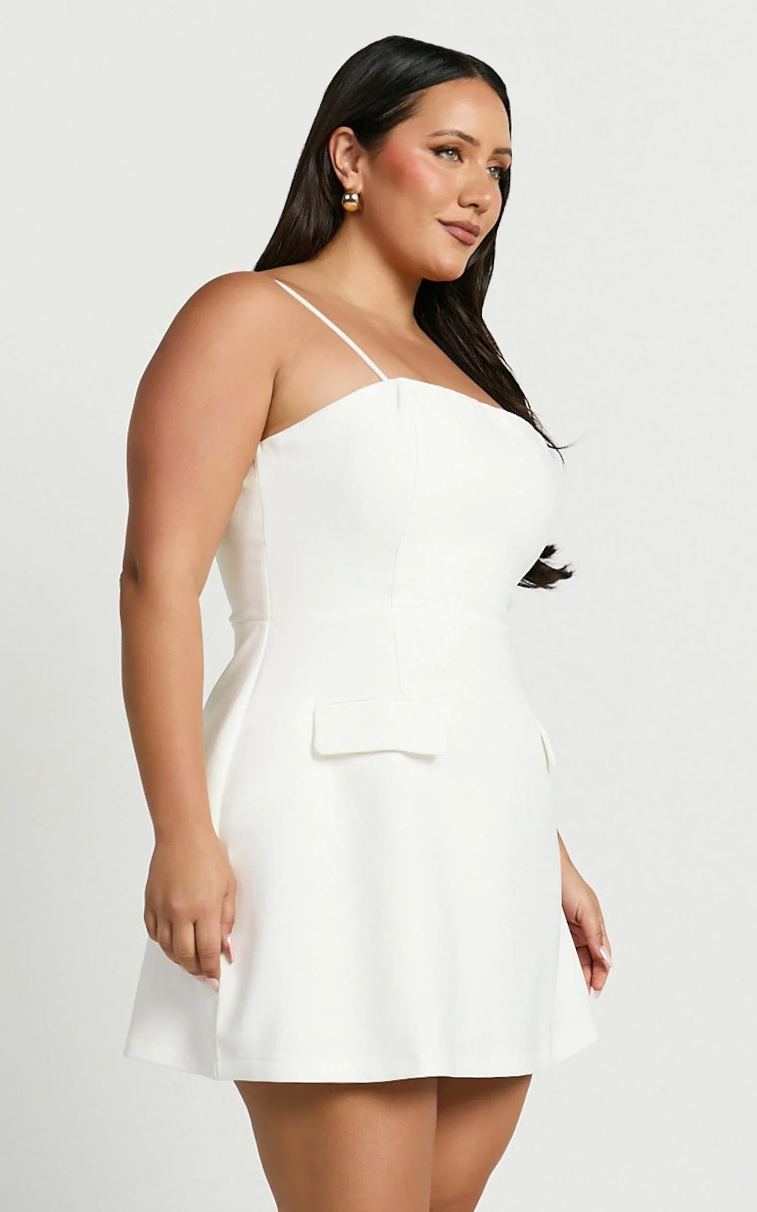 Featuring a flirty corset-style bodice, delicate straps, and an ultra-feminine A-line silhouette, this chic white mini dress effortlessly brings Couture Street Style vibes to your wardrobe. Playful yet sophisticated, it's perfect for pairing with chunky platform heels or styling casually under an oversized blazer for an insta-worthy look.
