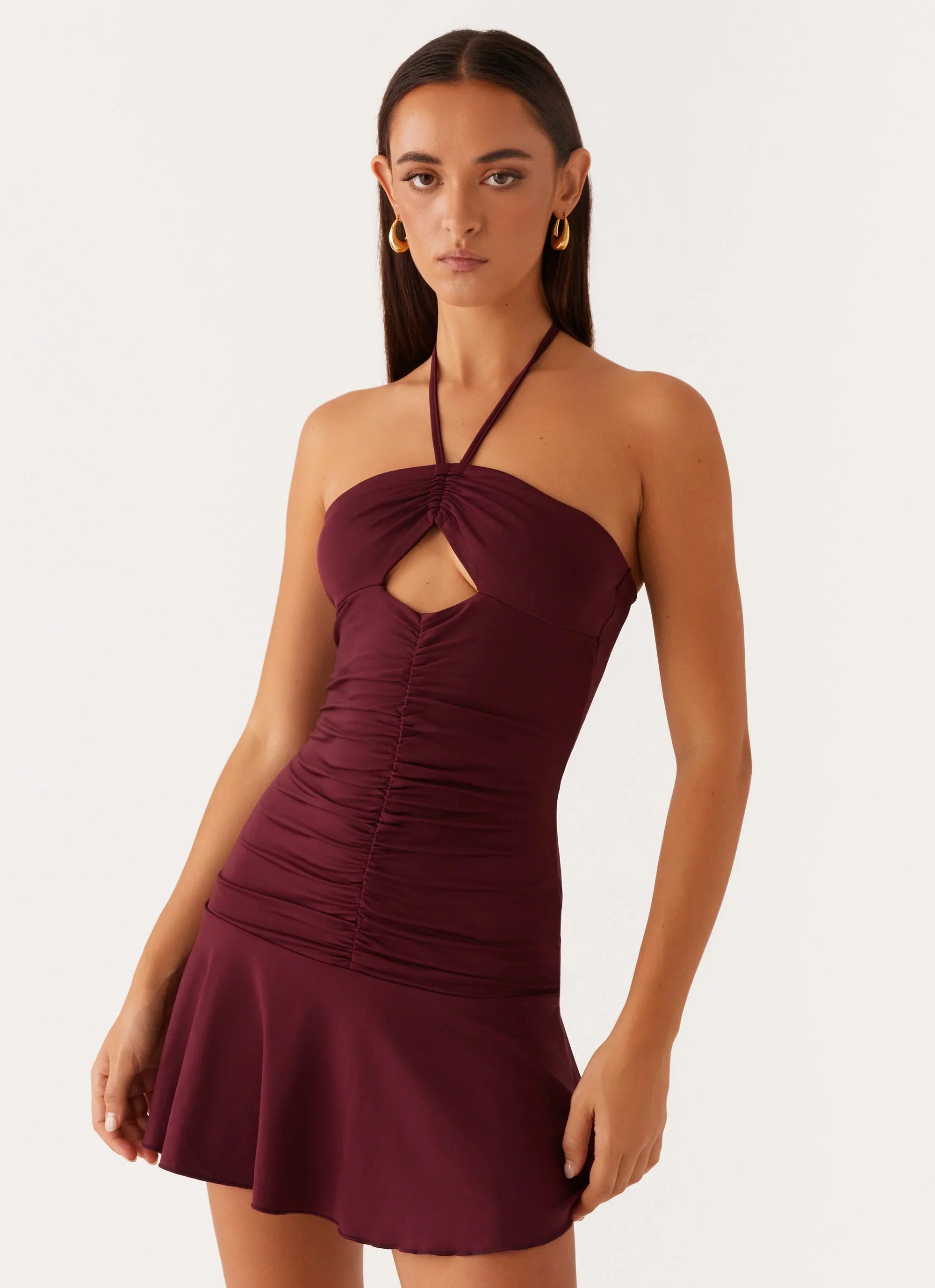 The Katrina Halterneck Mini Dress is all about playful allure. Featuring a ruched front that creates a flattering fit and a frilled hem that adds movement, this dress is made to stand out. The bold cut-out detail adds an edgy touch, perfect for those who live for the thrill of the night.