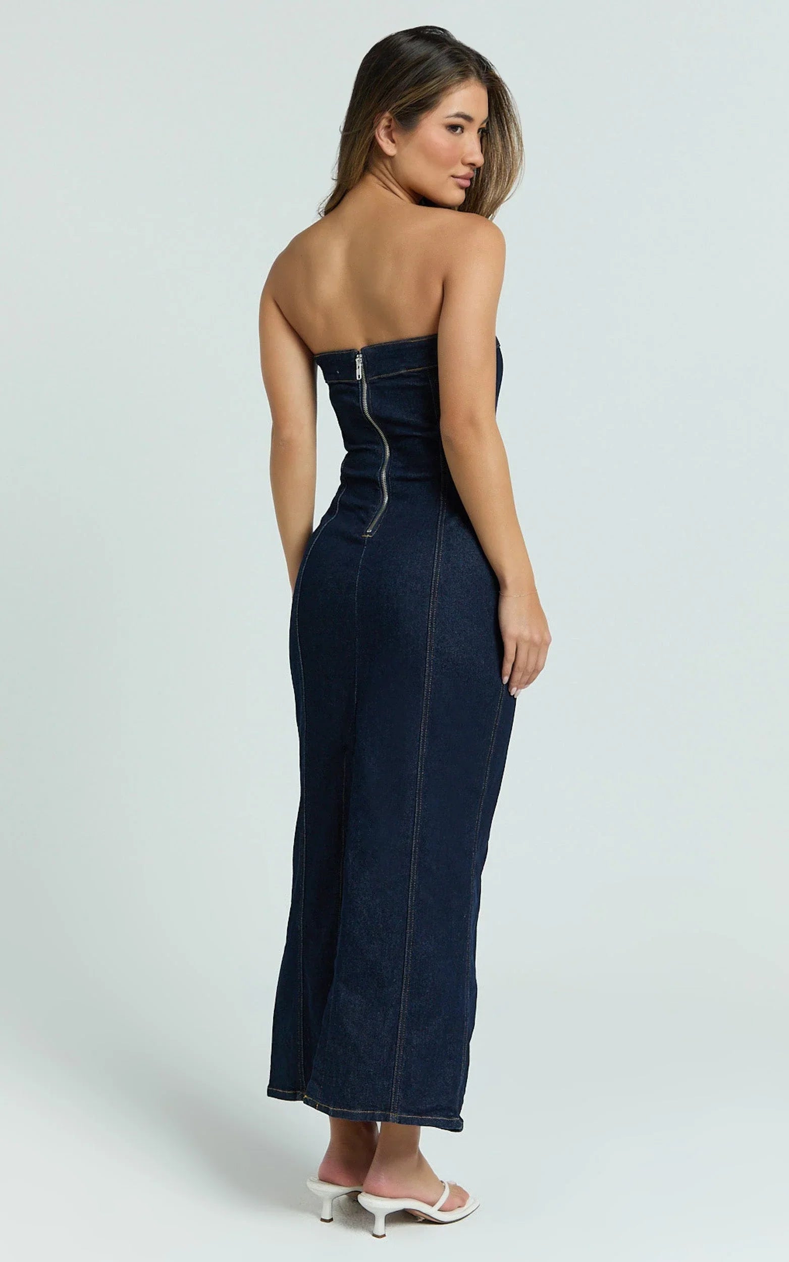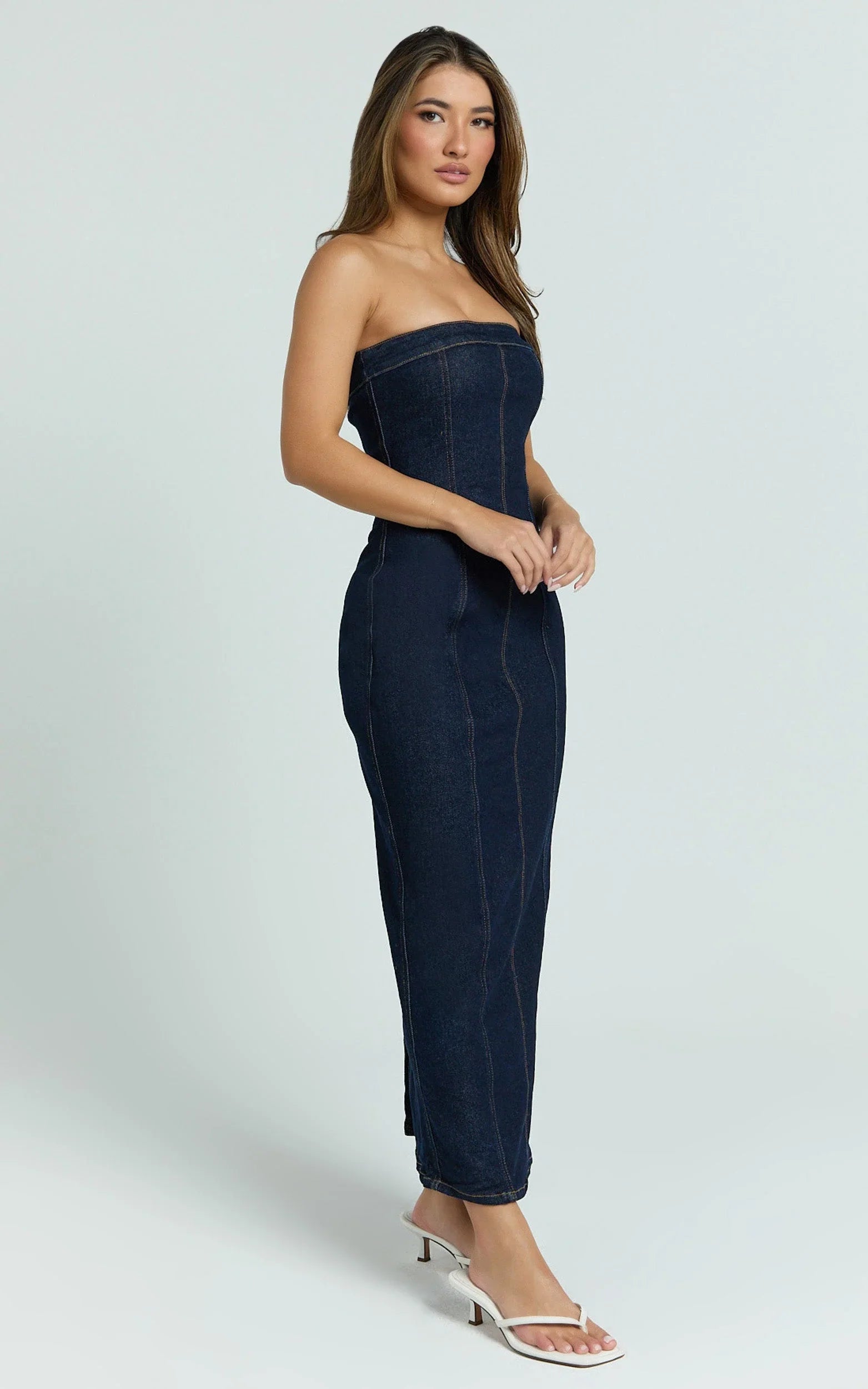 Snatched through the bodice with a sleek maxi silhouette and sultry side split, it sculpts and elongates while the indigo wash brings that Quiet Luxury vibe. Think statement outfit potential from brunch to after-hours, blue never looked so bold. The Keziah Maxi Dress nails effortless cool with clean lines and a flawless fit, giving Dresses a fresh, modern edge.