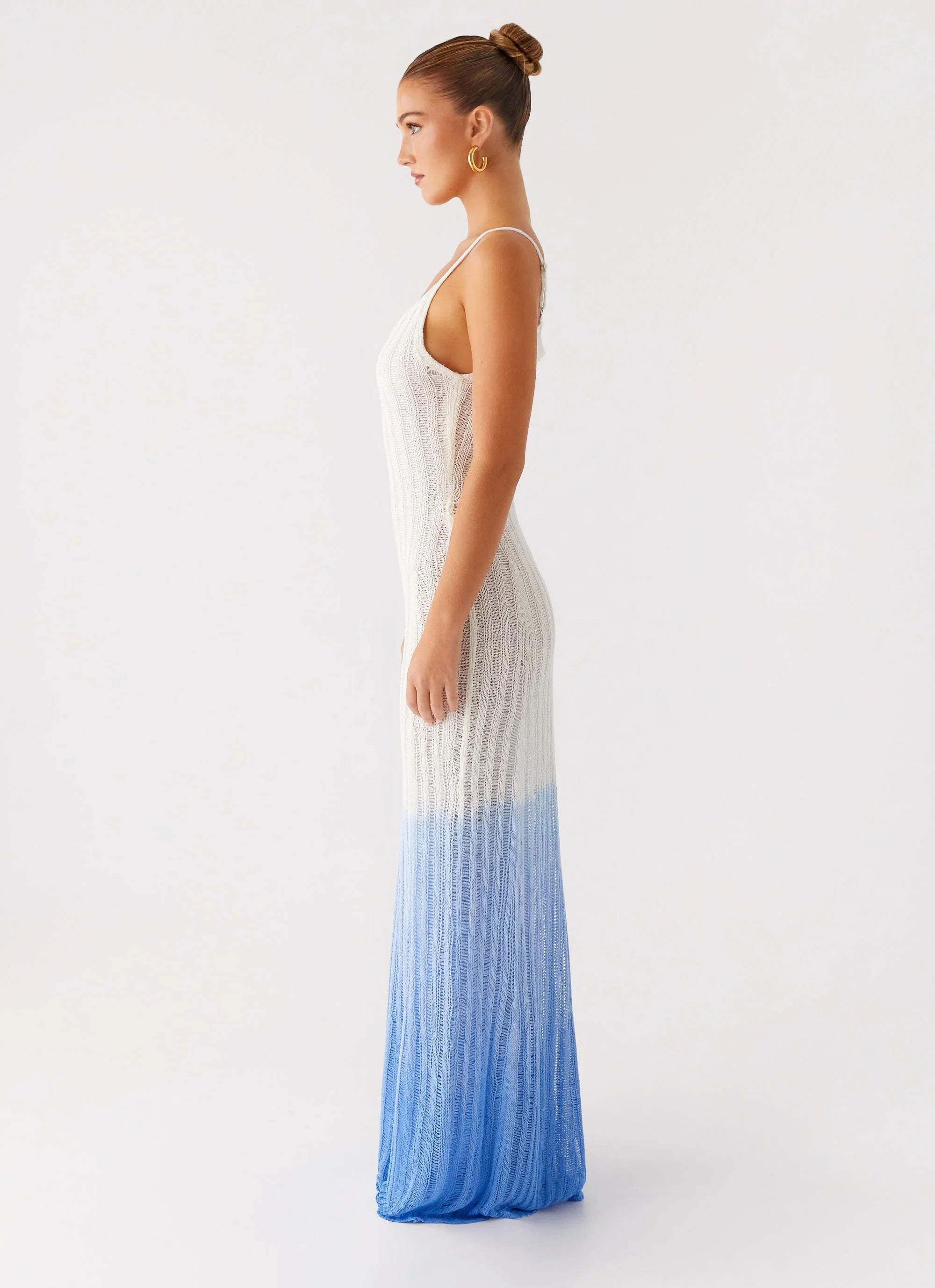 Meet your new sunset statement: the Kiki Maxi Dress. Designed with thin straps and a sweeping maxi length, this piece is crafted in a semi-sheer ombré knit that shifts with the light. It's the kind of dress made for golden hour moments and midnight escapes.
