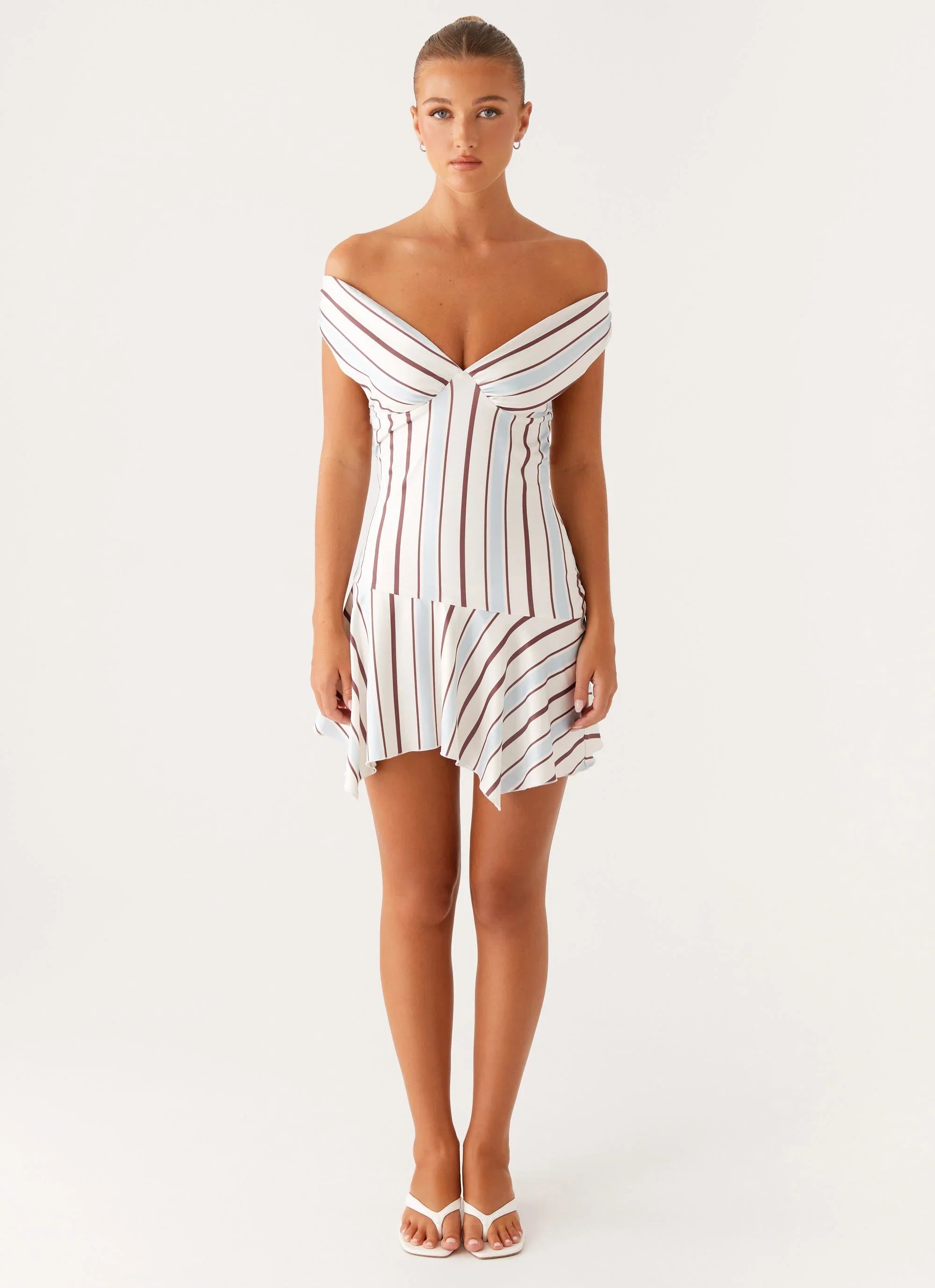 The Kirby Mini Dress is a chic and playful piece with an off-the-shoulder neckline and a fitted bodice that flows into a dramatic handkerchief hem. Featuring exclusive print and gripper tape for a secure fit, this dress also boasts an open back for a flirty finish.