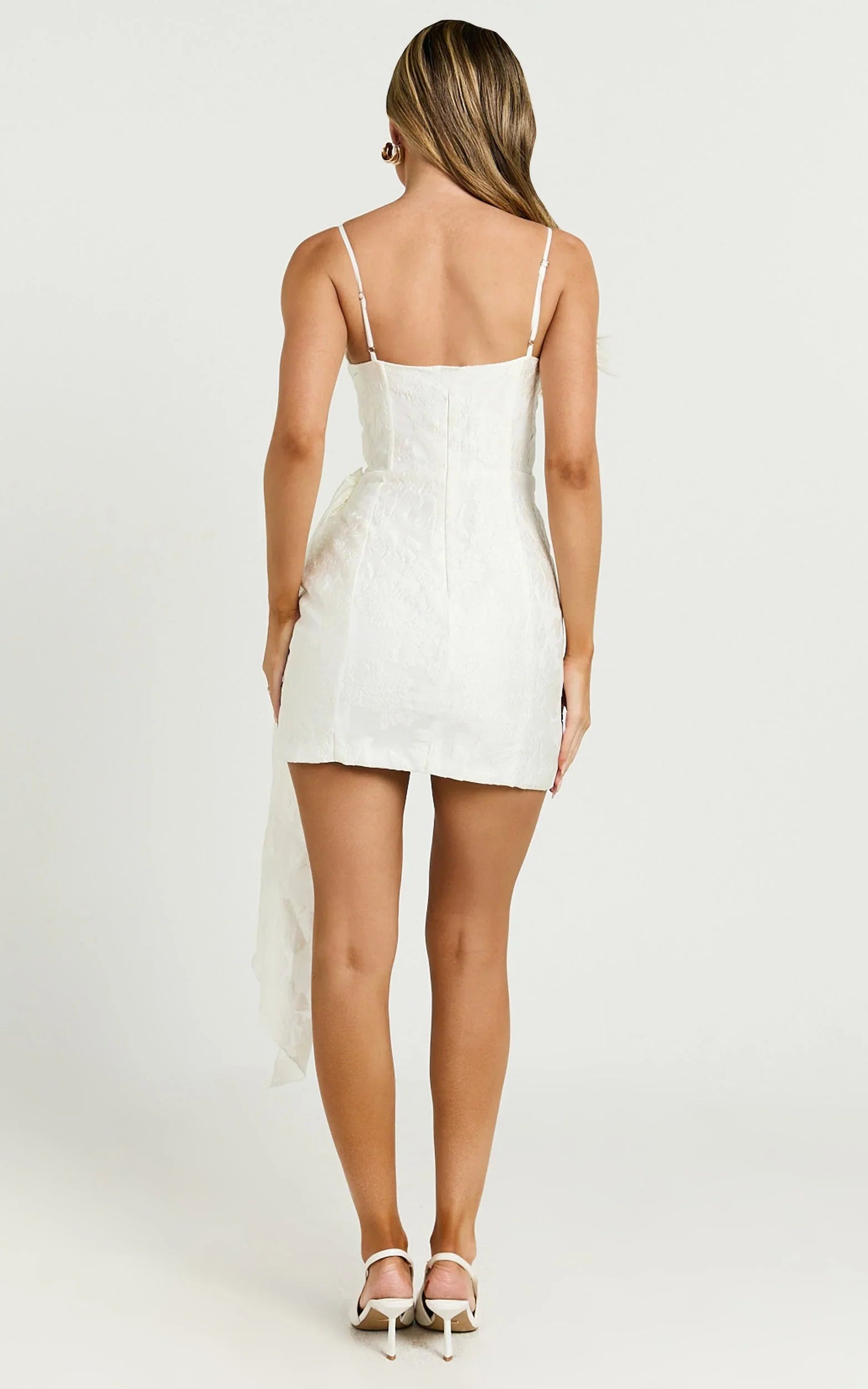 Elevate your wardrobe with the Laine Mini Dress - a true embodiment of sophistication and empowered style. This jacquard draped dress in pristine white is more than just an outfit; it's a statement. Designed for the modern woman who appreciates the blend of tradition and trend, it’s perfect for any event from a sunlit party day to an elegant evening affair.
