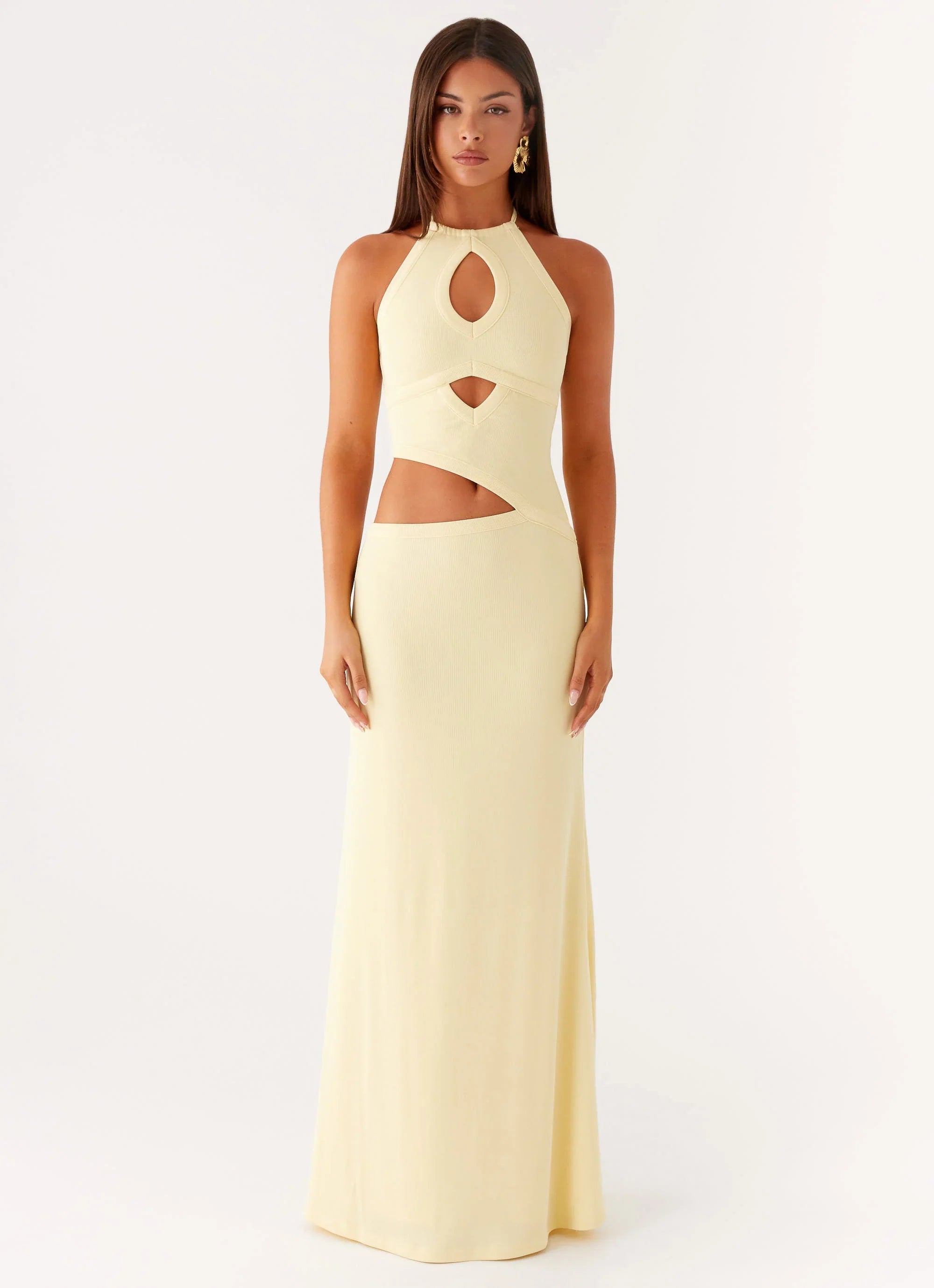The Lanah Cut Out Maxi Dress is bold and striking, designed to turn heads. Featuring a halter neckline and an open back, it offers a sleek, flattering silhouette with just the right amount of edge.