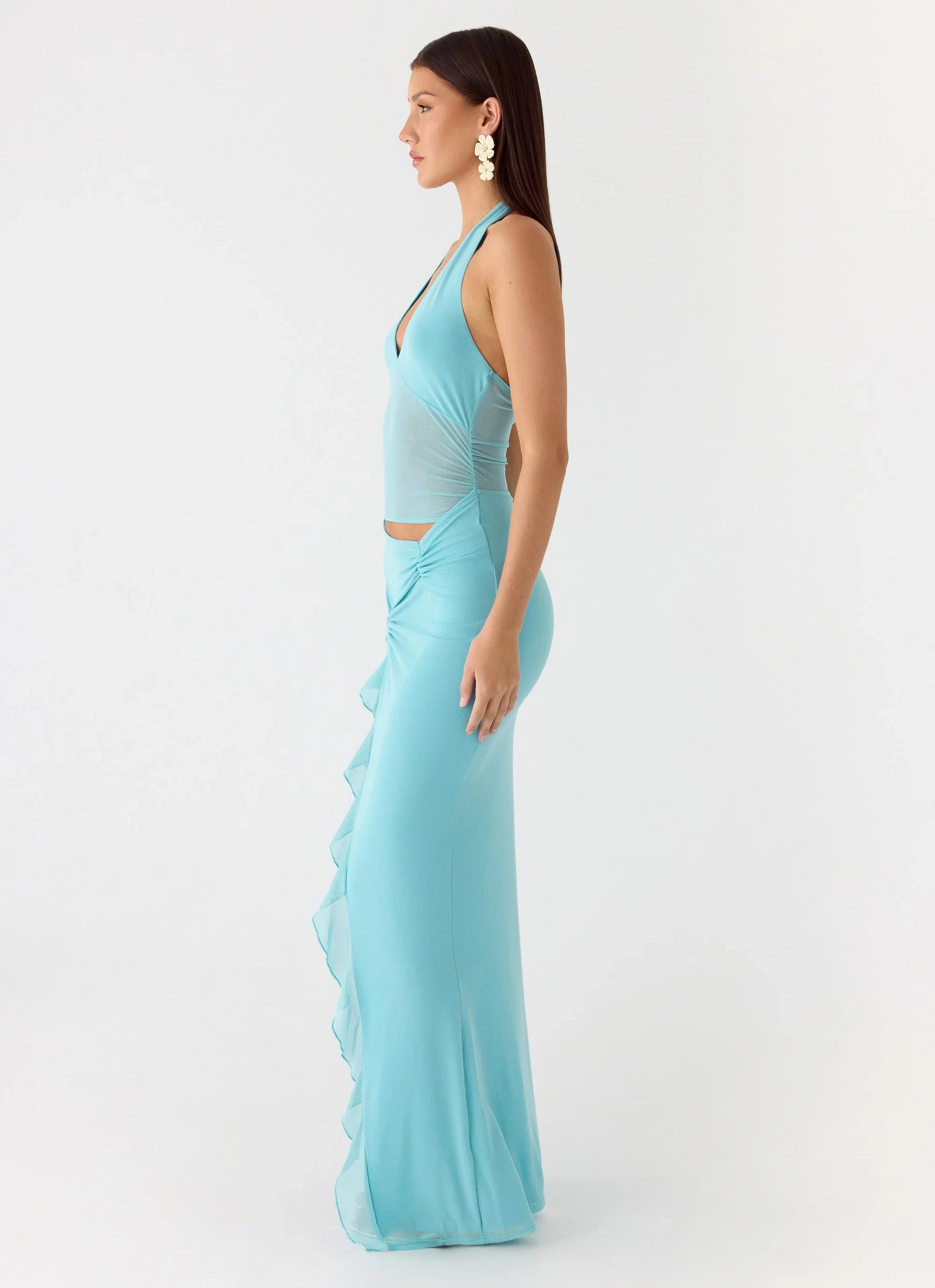 The Last Sequence Maxi Dress is made for golden hour moments and long summer nights. Featuring a halter neckline with tie straps, a sheer mesh bodice, and a flowing maxi skirt with ruffle detailing and a side split, this fully lined dress offers a chic, feminine silhouette with just the right amount of drama.
