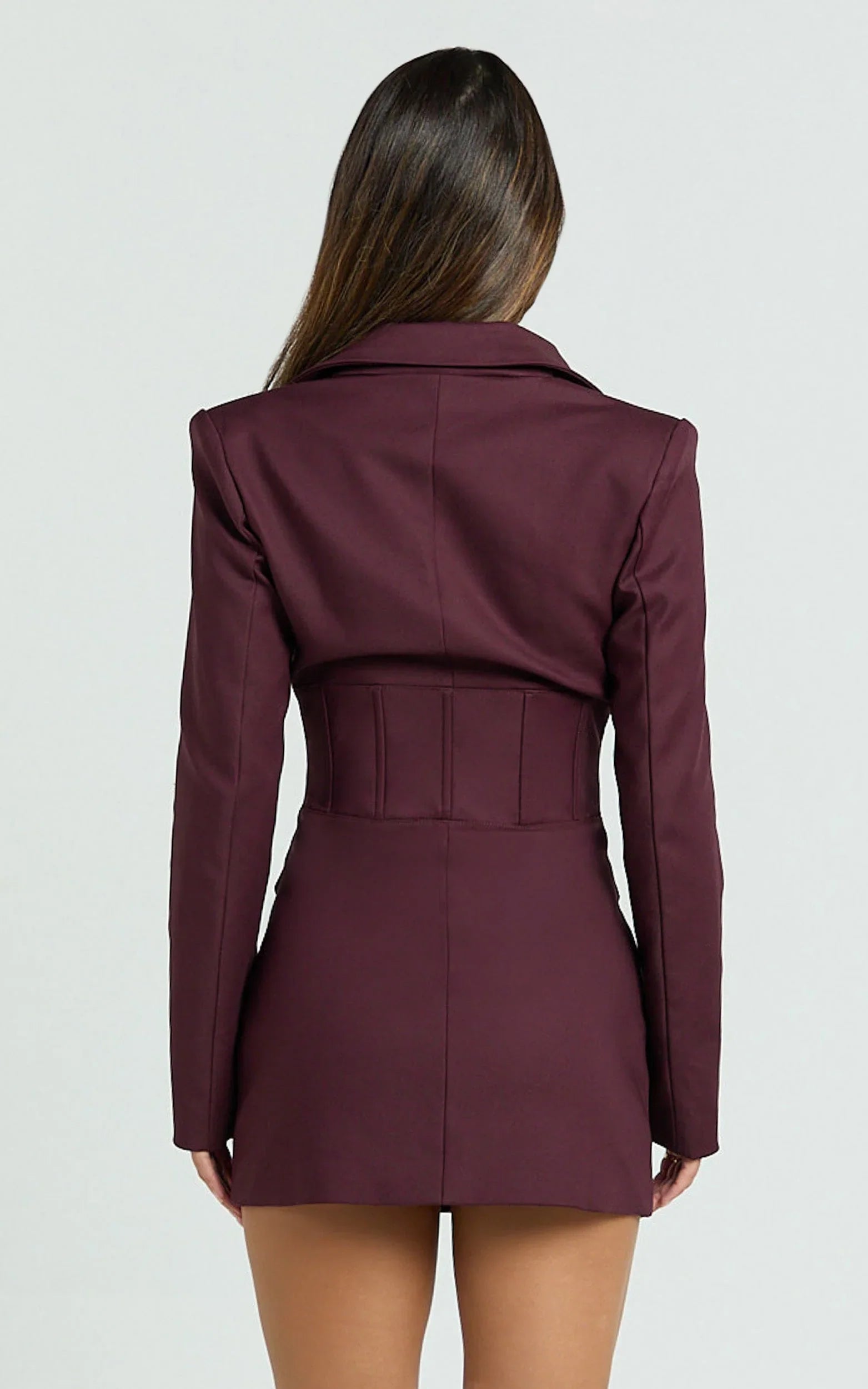 This wine mini blazer dress nails the fit-and-flare silhouette with a structured hook-and-eye front that shapes the waist and keeps the lines clean. A confident desk-to-dinner piece, it brings that tailored edge while staying flirty and femme—perfect for events, date nights, and those big “I’ve arrived” moments.