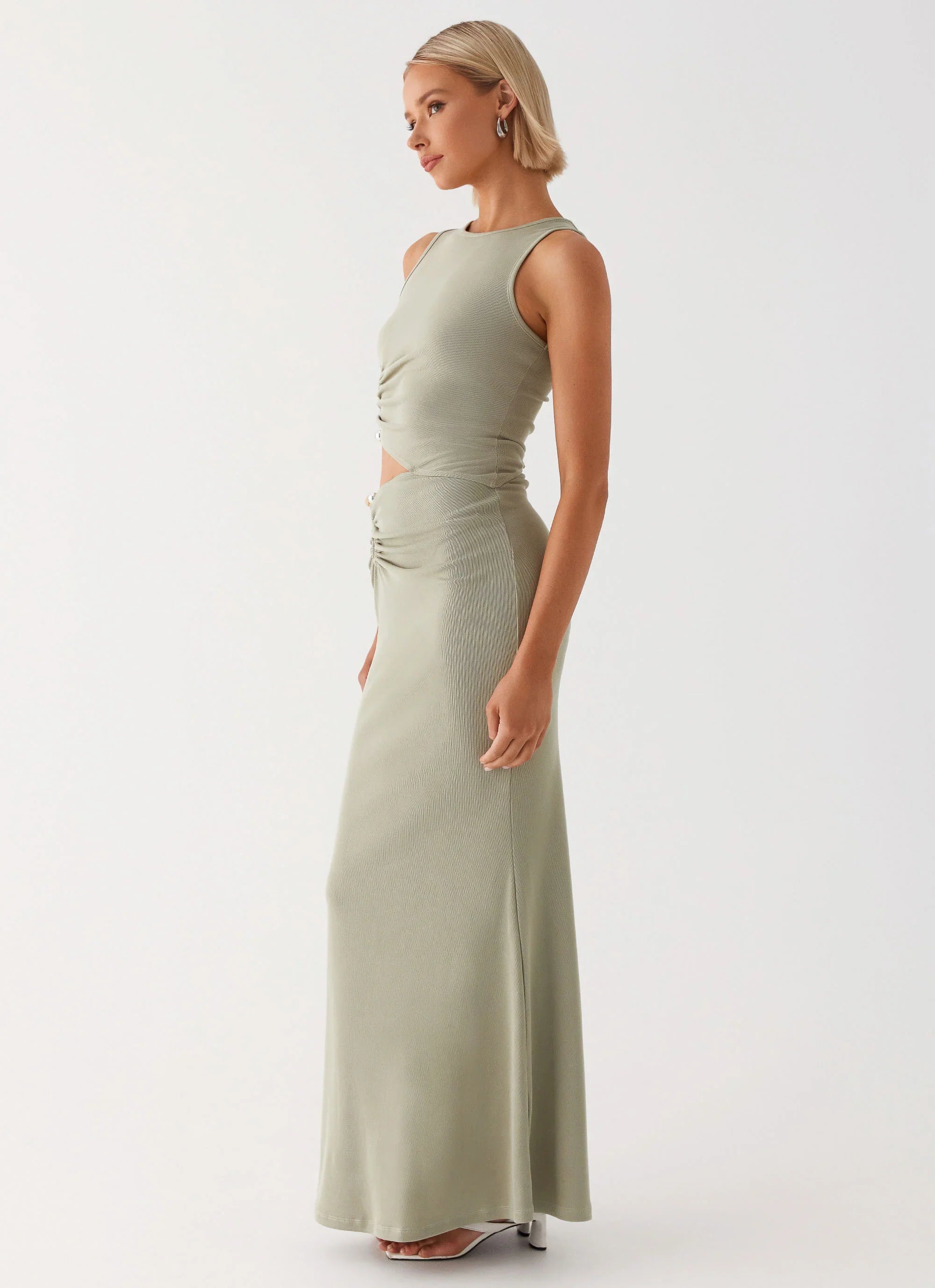 Elevate your evening style with the Lennox Maxi Dress. Made from a stretch jersey for a figure-hugging fit, this dress showcases a striking round neckline and daring side cutouts, blending sophistication with bold allure.