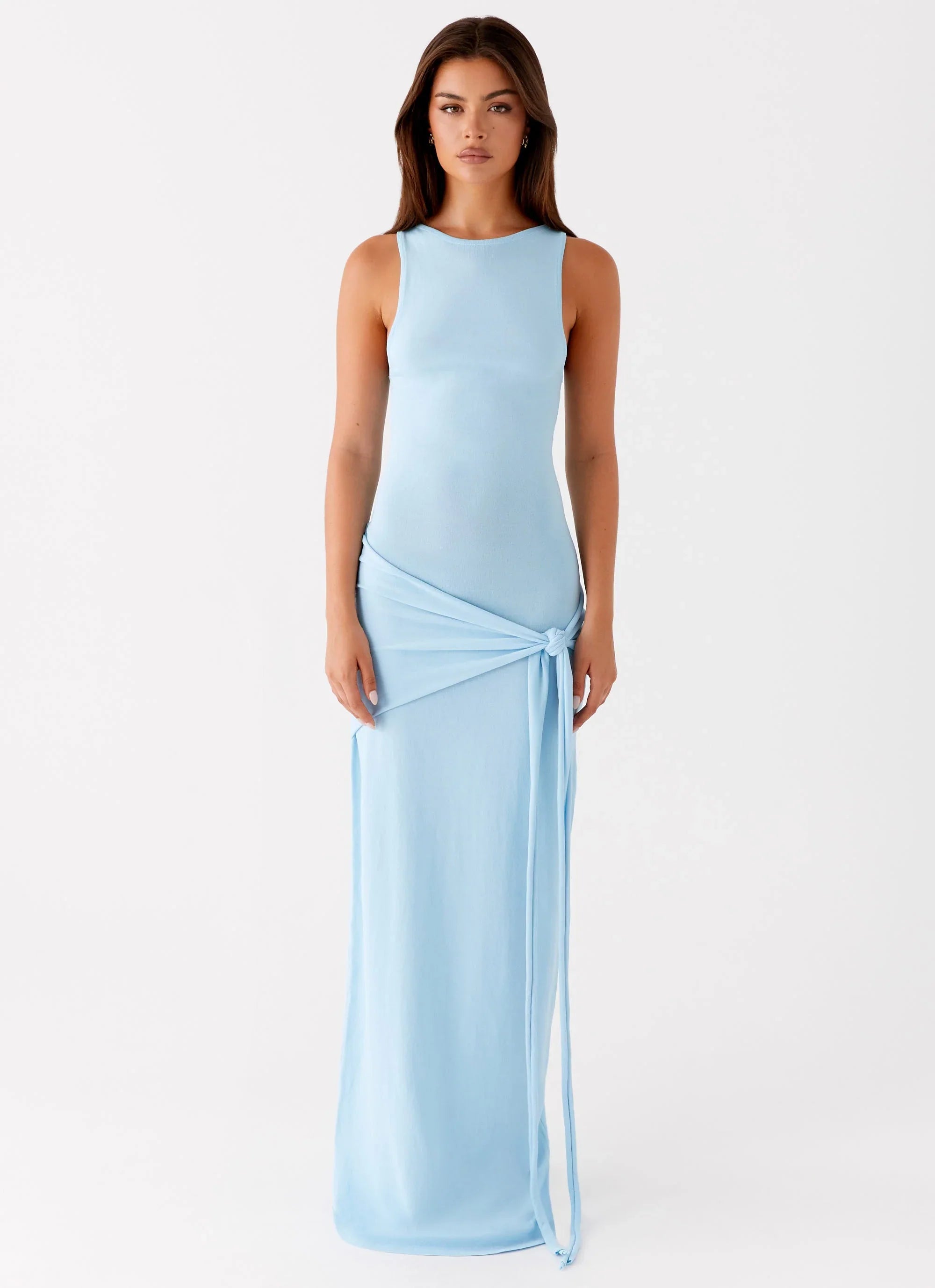 Crafted in a fitted knit fabric, the Leona Maxi Dress features a high scoop neckline and sleek silhouette. Hip overlay panels add subtle dimension, finishing in a chic maxi length.