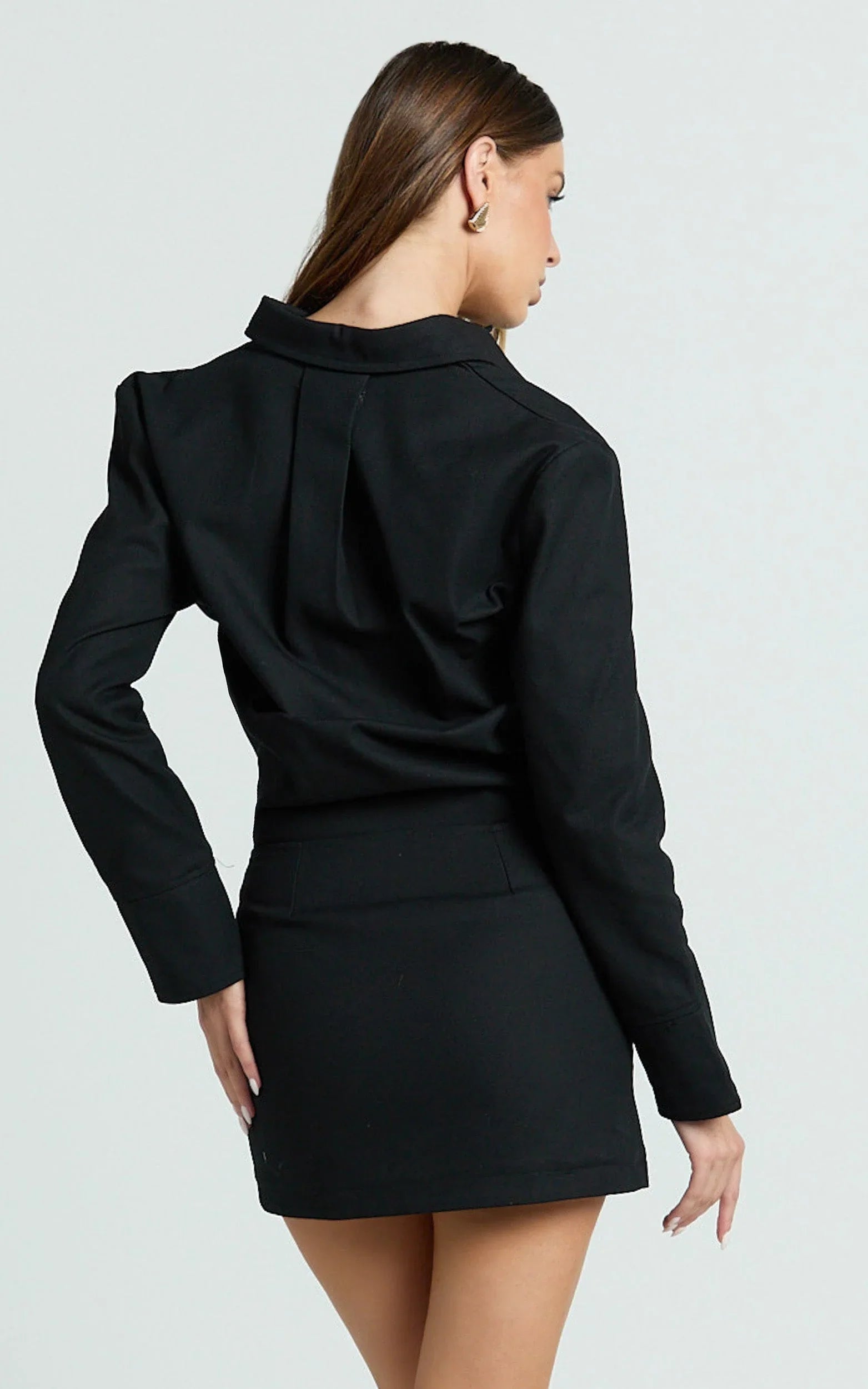 With its classic button front, long sleeves, and deep black hue, the Lizzie Mini Dress is your shortcut to polished style, just add wedge sneakers to tap into must-have street chic vibes.