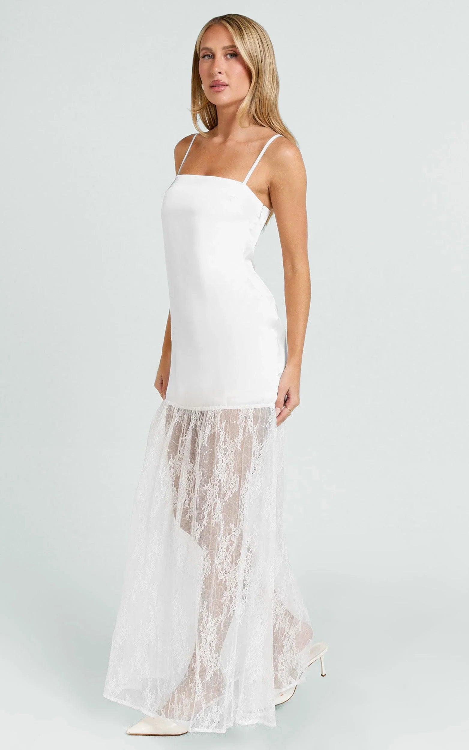 Loren Maxi Dress - Square Neck Contrast Skirt Dress In White leans into sculptural volumes in the best way, streamlined up top, statement sweep below. Style it with minimalist sandals and an envelope clutch to keep the look sleek, or add metallics for a little shine. Perfect for brides-to-be events, long lunches and any RSVP where chic is non-negotiable.
