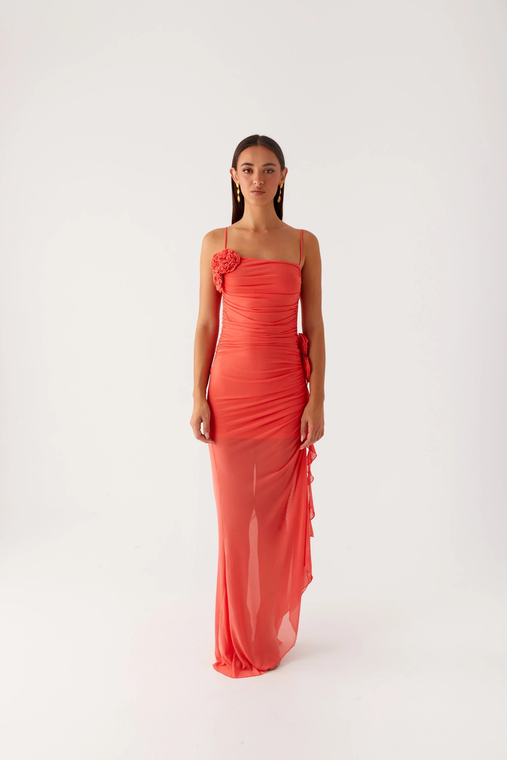 Soft, feminine, and full of grace — the Louana Maxi Dress brings the perfect balance of elegance and texture. With a straight neckline, delicate flower appliqué, and gathered side seam, it’s made for those who live for the beauty of the night.