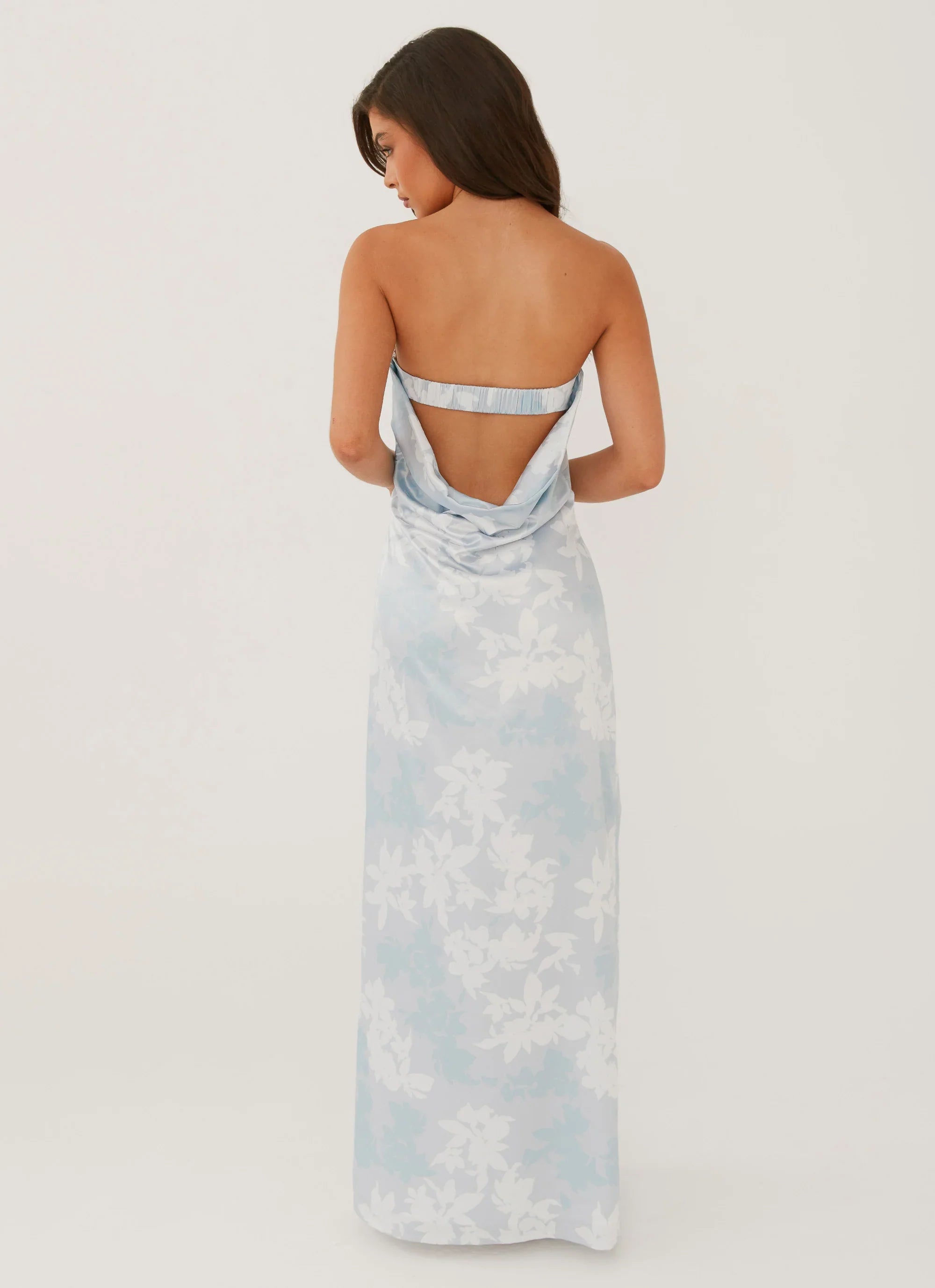 Indulge in refined glamour with our Love Me More Maxi Dress. This full-length dress showcases a sleek strapless silhouette, bias cut, and a draped cowl back feature. Perfect for golden skies, balmy nights, and enchanting nightclub scenes. Elevate your style for unforgettable moments under the moonlight.