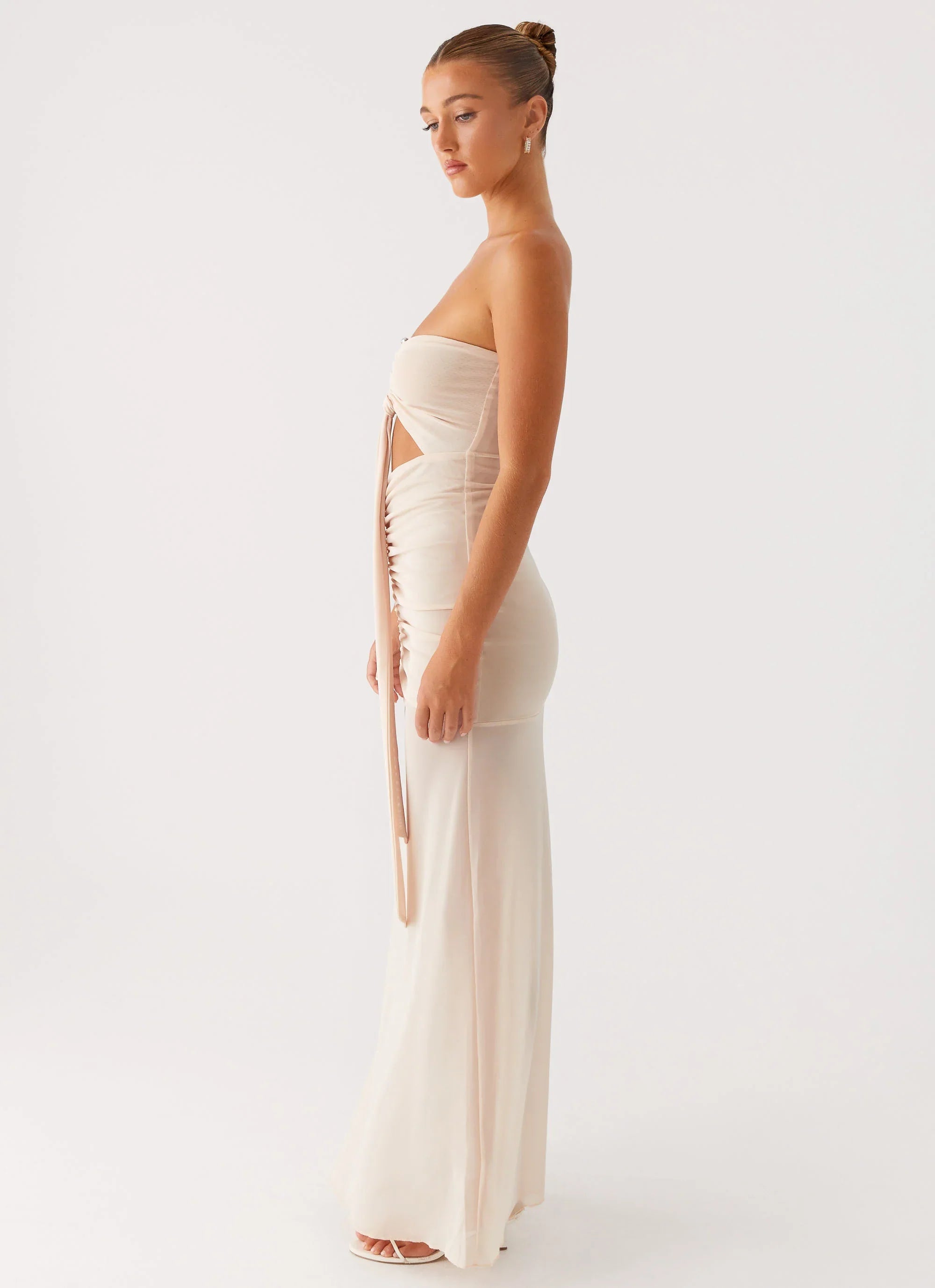 Pure allure. The Lovie Maxi Dress features a strapless, straight neckline with front strap detailing that adds a touch of boldness. Sleek and striking, it's made for nights where you steal the spotlight and keep the energy alive from dusk till dawn.