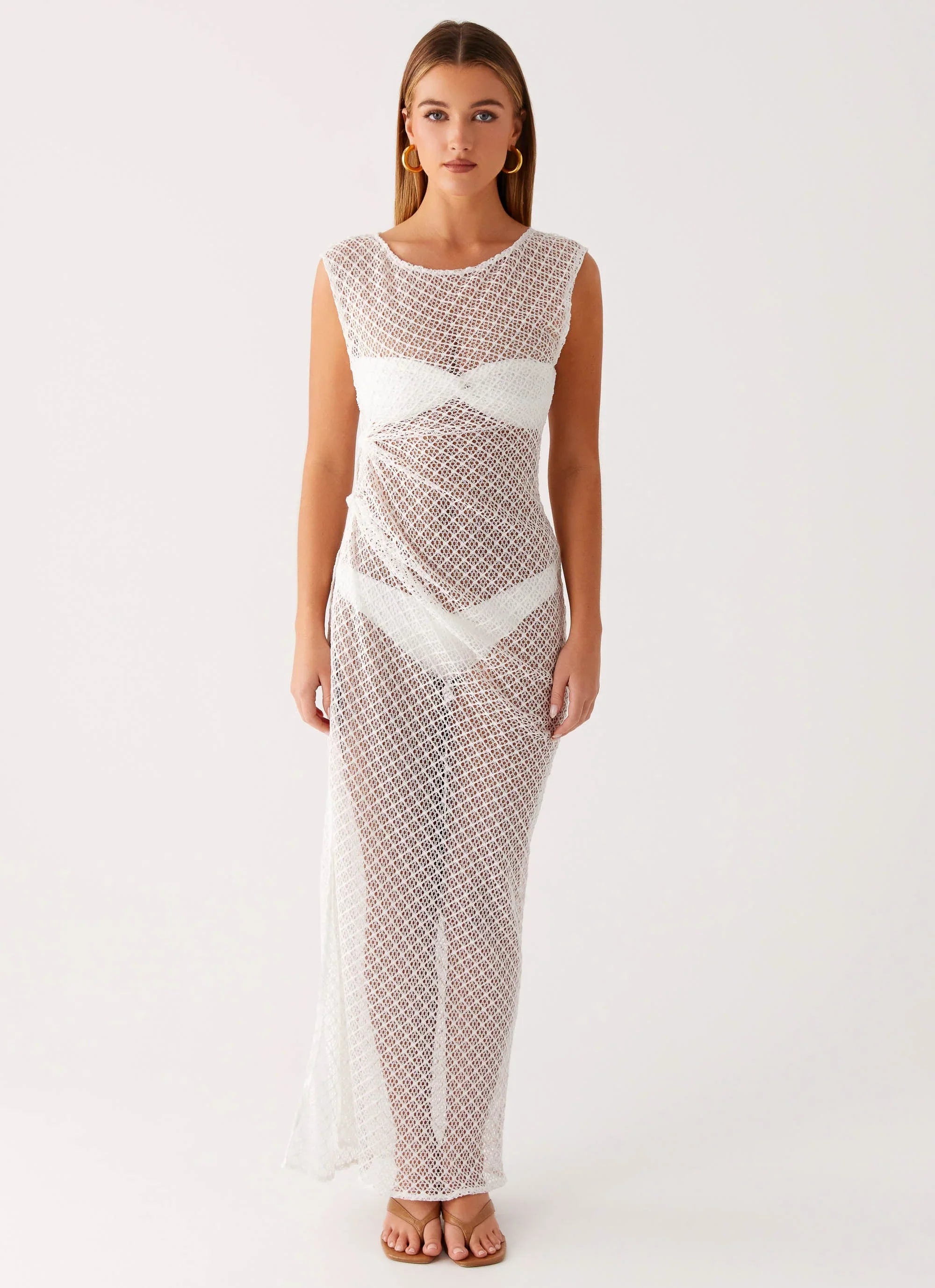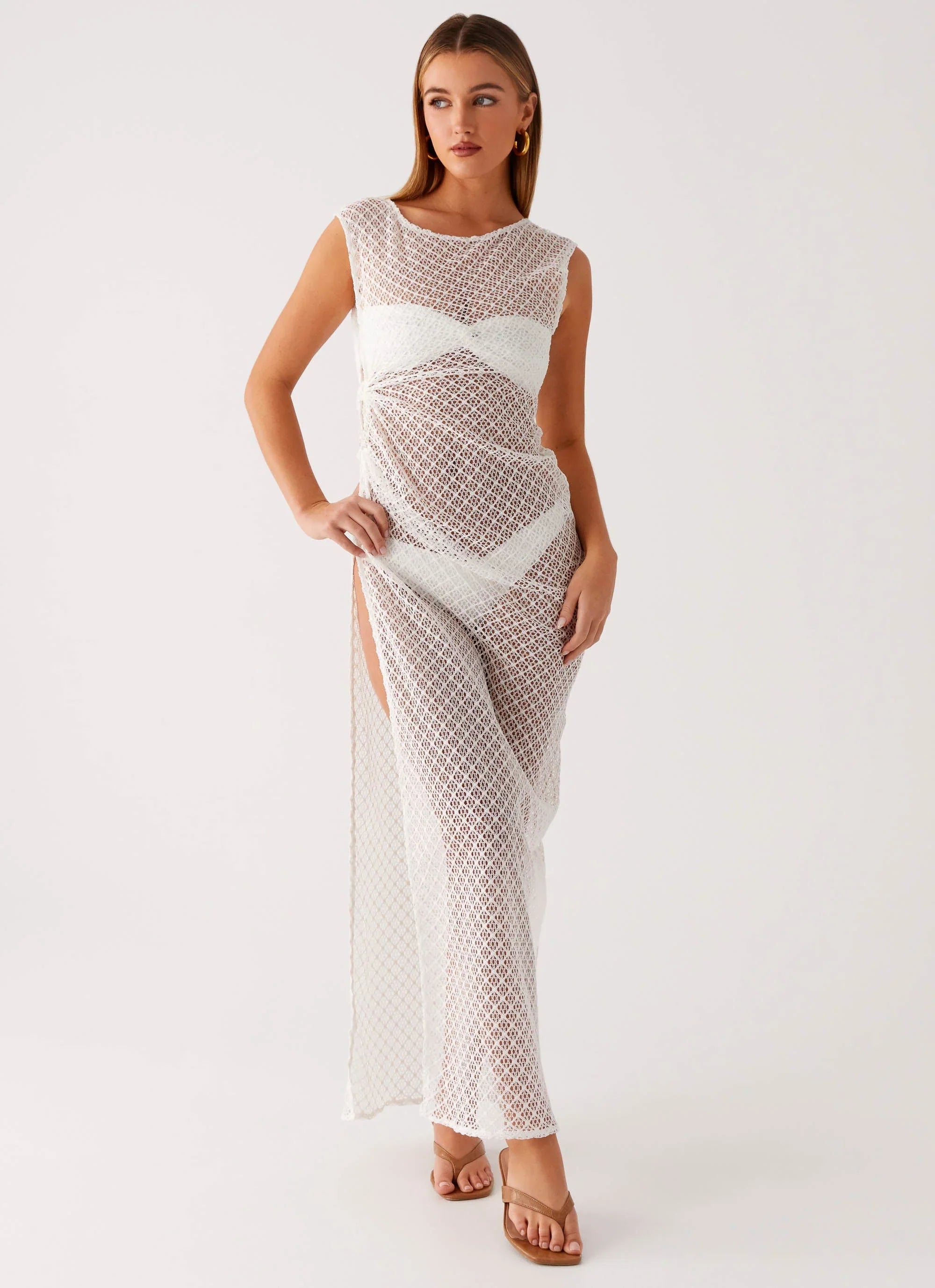 The Maeva Maxi Dress is your effortless swim cover-up with a twist. Crafted from semi-sheer knitted material, it features a maxi length, rounded neckline, open knotted side, and a side split for easy movement. Unlined and breezy, it’s perfect to throw on over your swimwear and step into sunset vibes.