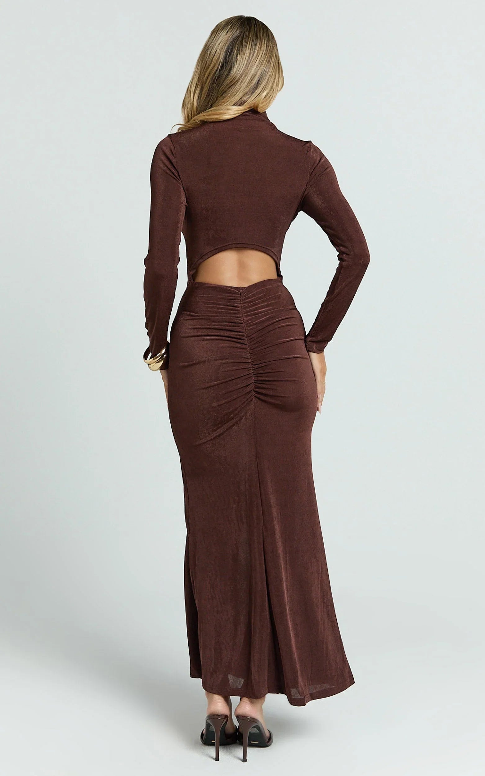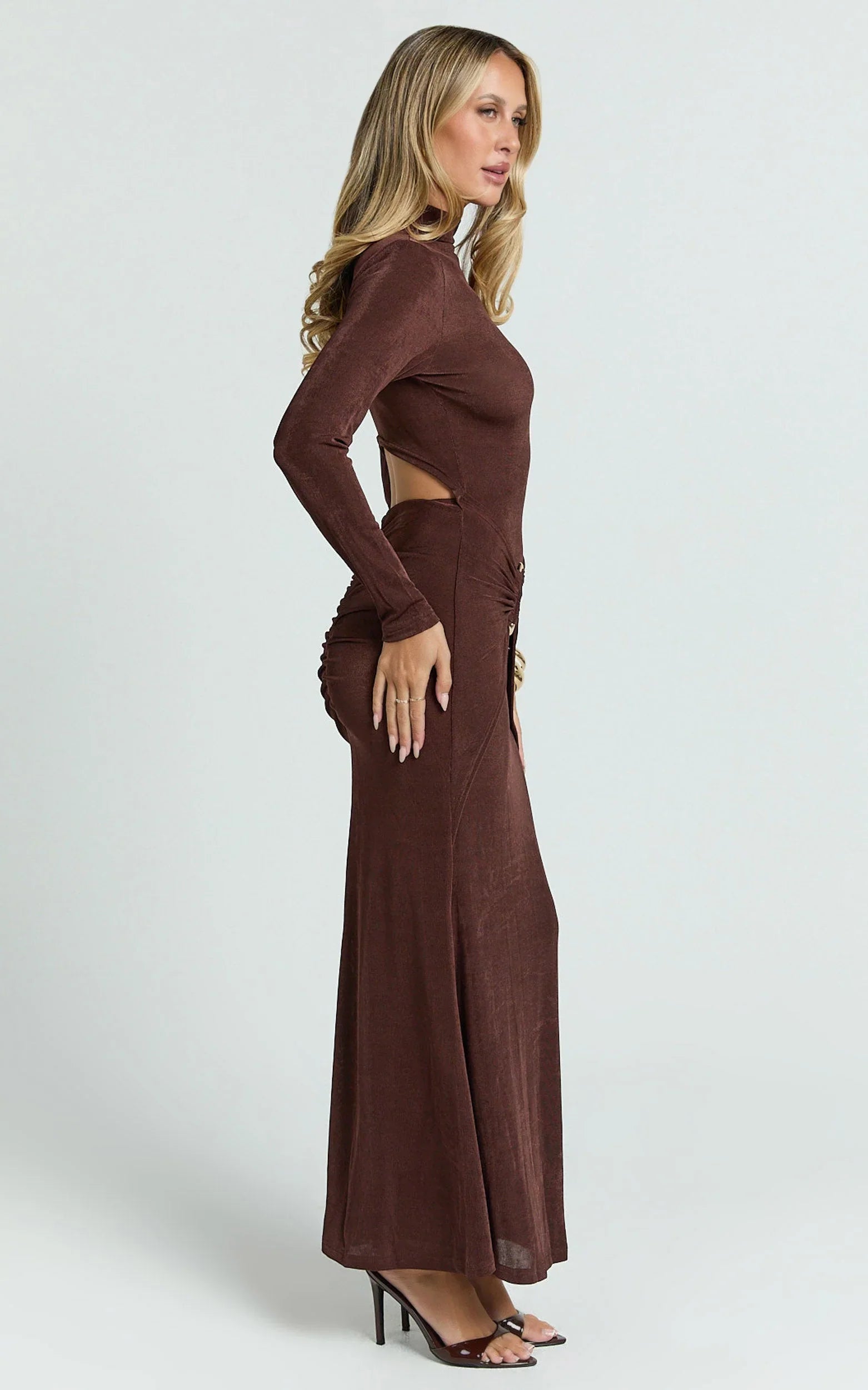 Cut to skim and elongate, the flattering twist detail and deep V give shape while the maxi length brings drama. Think quiet luxury meets Old Money aesthetic, timeless, polished, and ready for every RSVP. The sultry brown hue slots seamlessly into your lineup of Dresses, styling effortlessly with barely-there heels and a sleek shoulder bag.