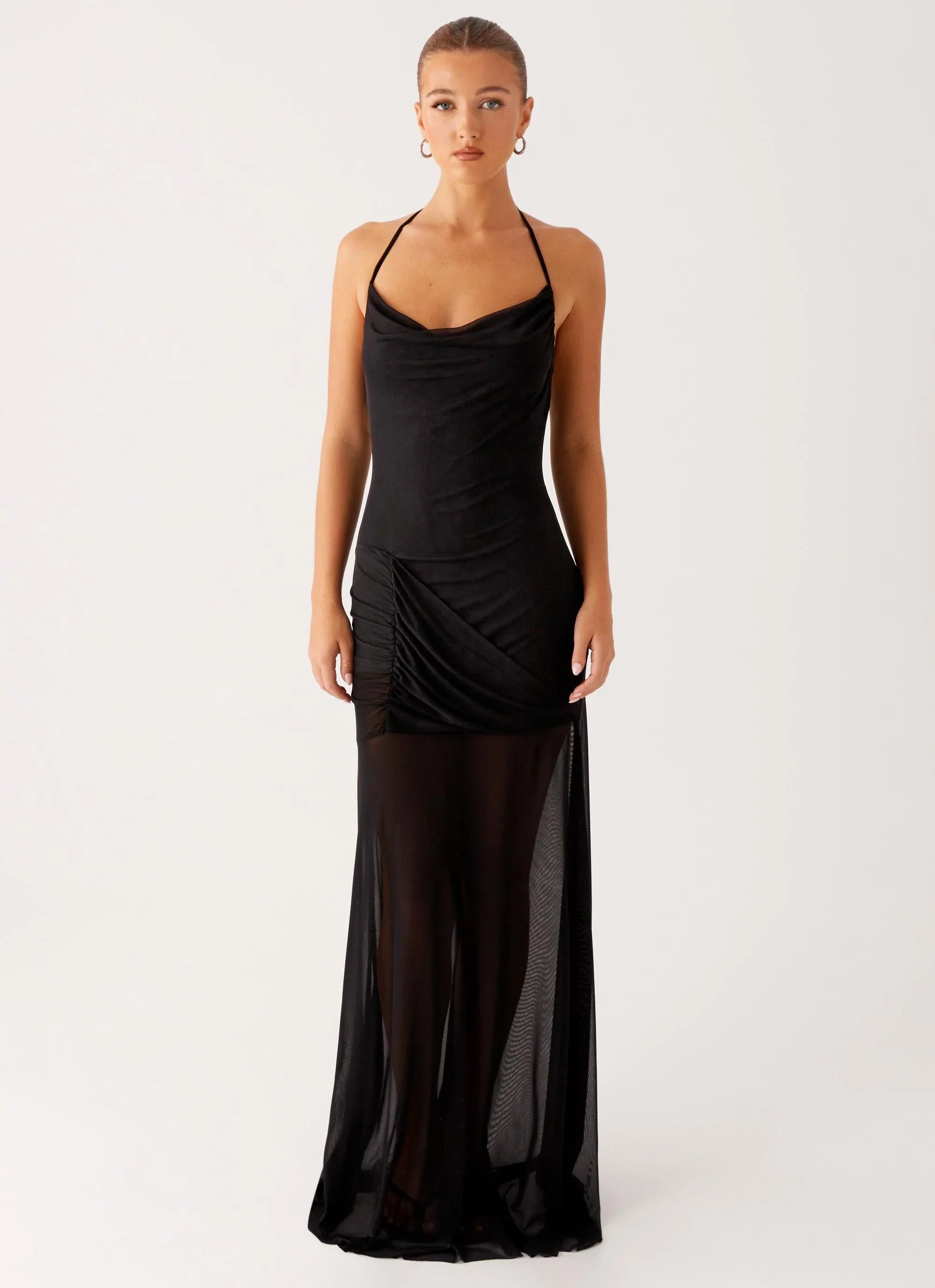 Dreamy and dramatic, the Mckinley Maxi Dress is made for golden skies and dancefloor lights. With a soft cowl neckline, ruched waist, and thin neck tie straps, this maxi flows with you from sunset to afterparty.