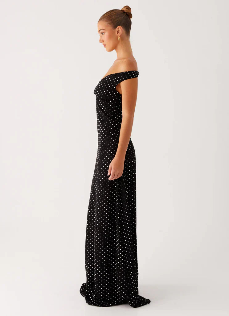 Effortlessly chic and made to move, the Melany Maxi Dress in Black Polka Dot is your perfect after-dark companion. With an off-the-shoulder neckline, open back, and a semi-fitted silhouette, it’s all about the drama in the details.