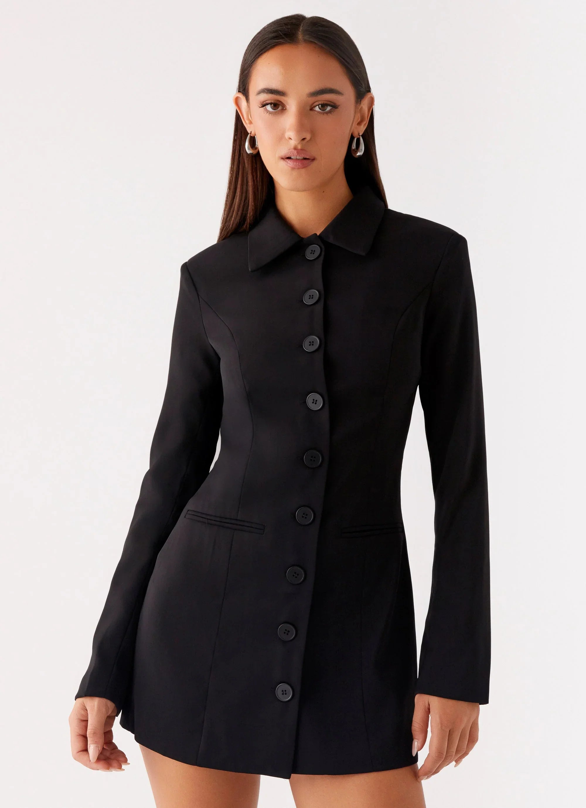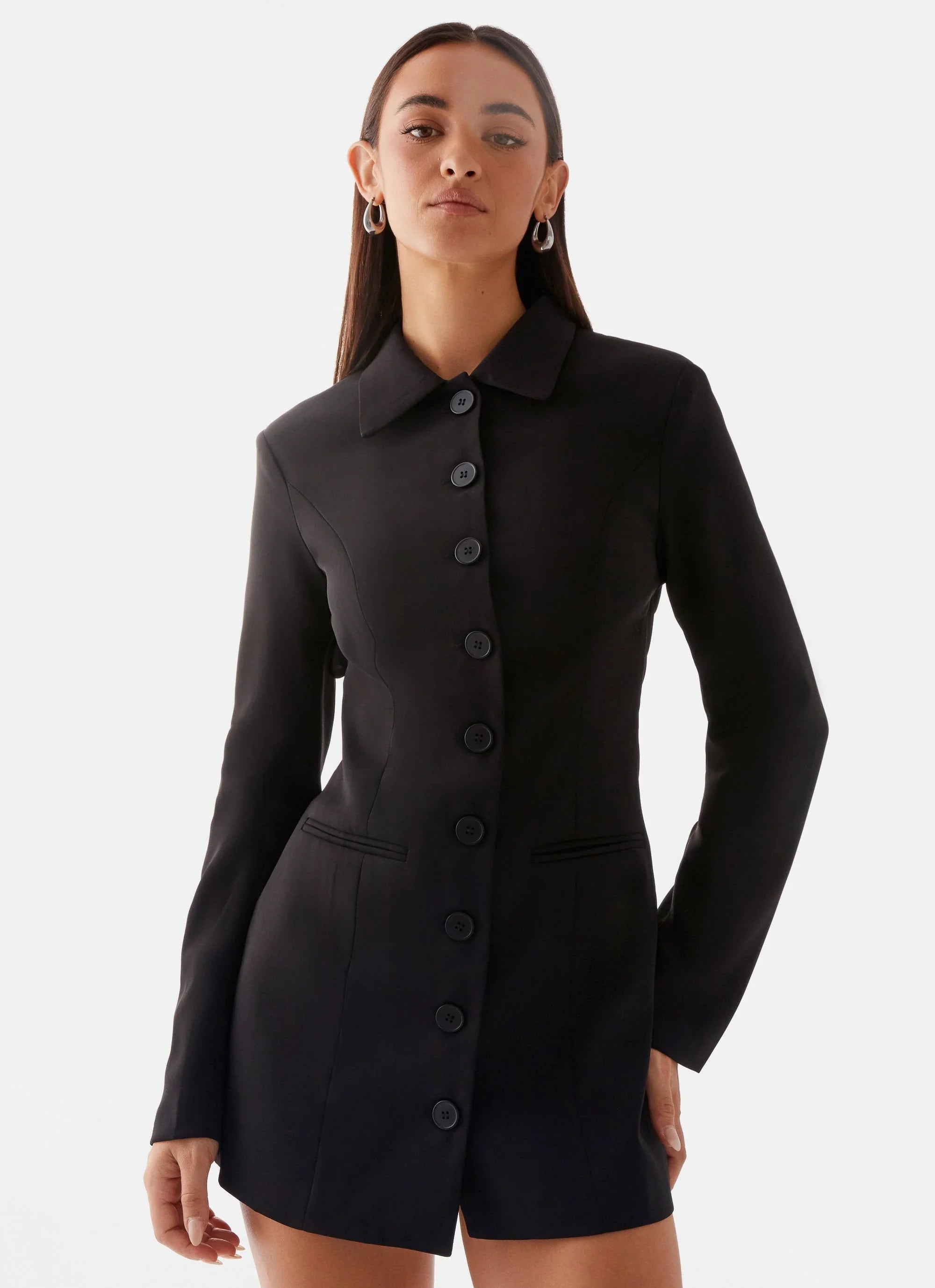 The Memphis Blazer Mini Dress brings tailored edge to your after-dark wardrobe. Featuring a high collared neckline, front button opening, and loose fitted long sleeves, this fully lined piece is finished with front pockets and a bold open back for a modern twist on classic tailoring.
