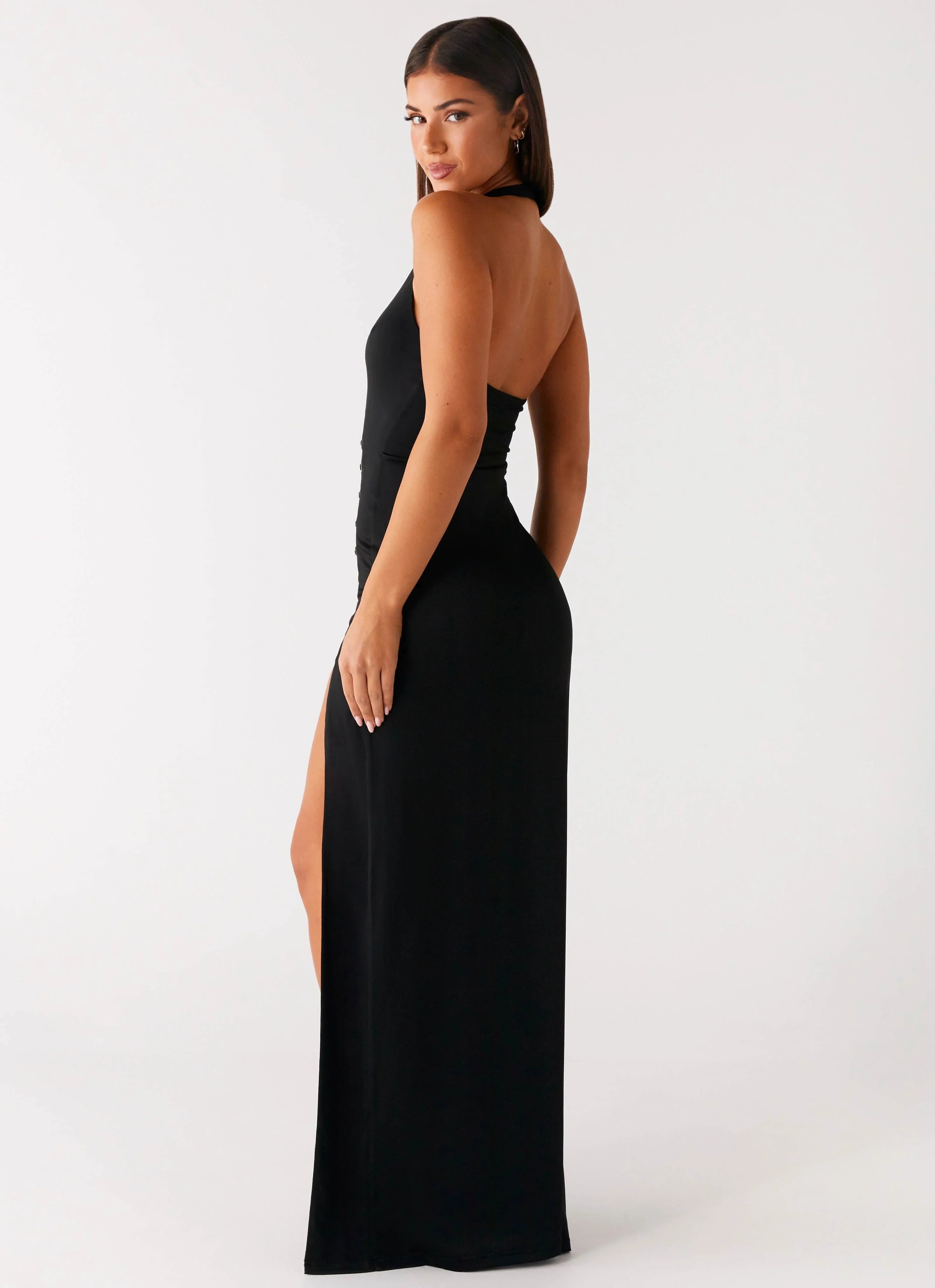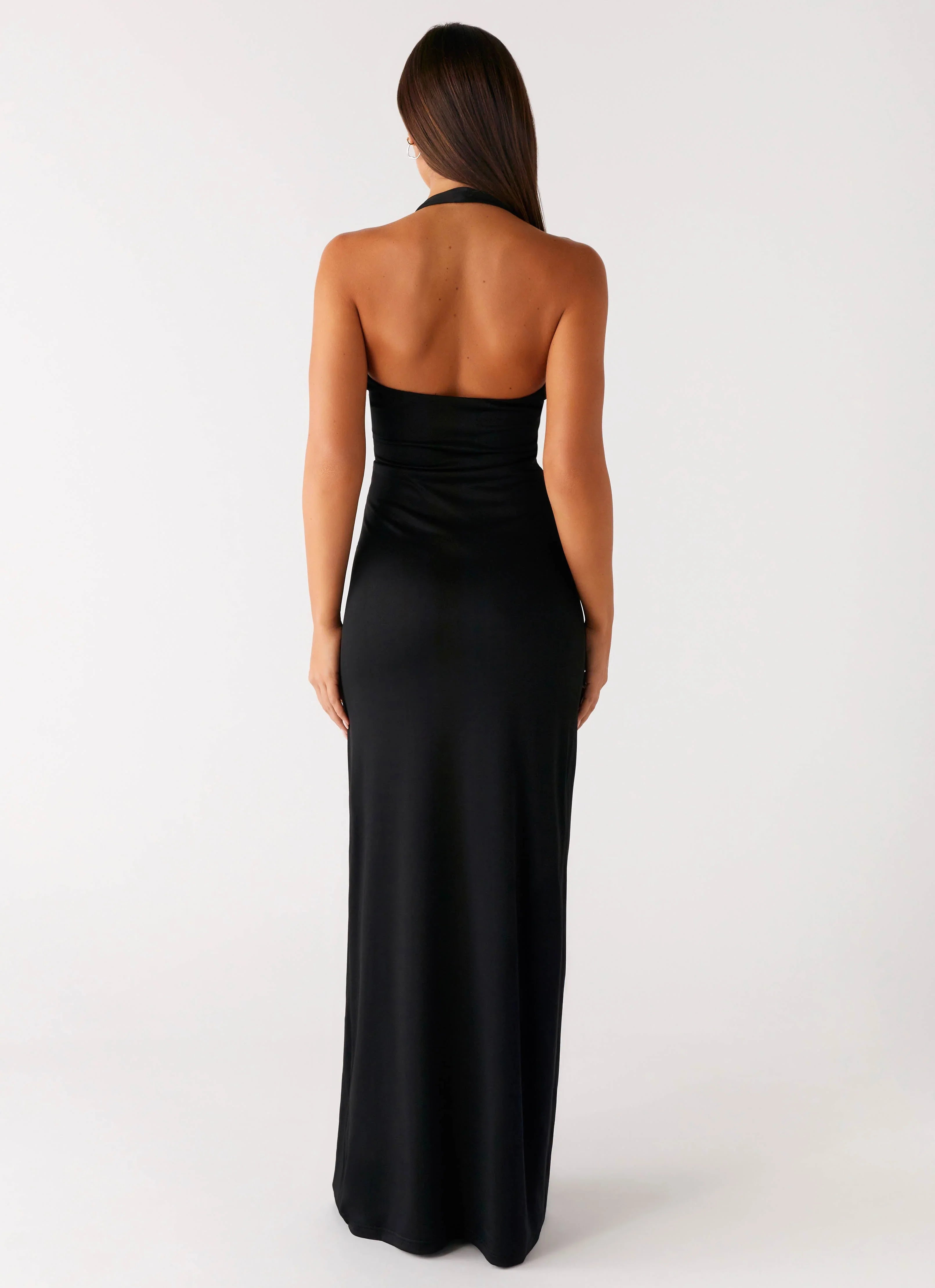 The Midnight Dreams Maxi Dress is designed with a flattering low neckline and halter neck strap. Featuring front cut-outs, a low back, and a front side split, it’s crafted from stretch jersey and fully self-lined for comfortable, sleek wear from dusk till dawn.